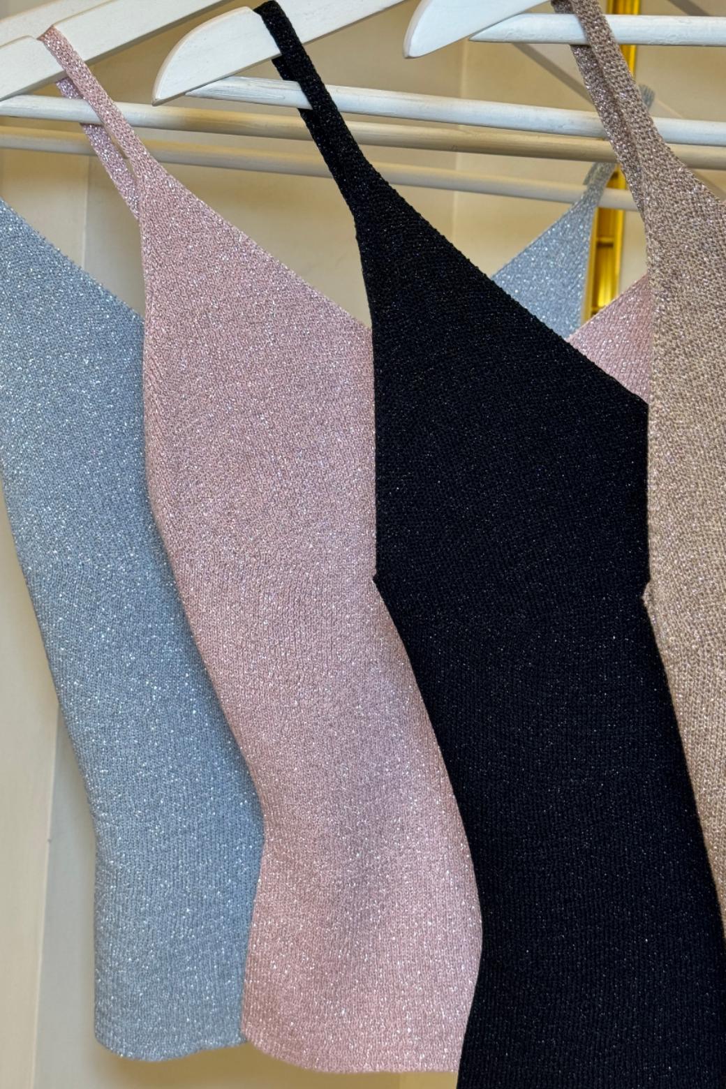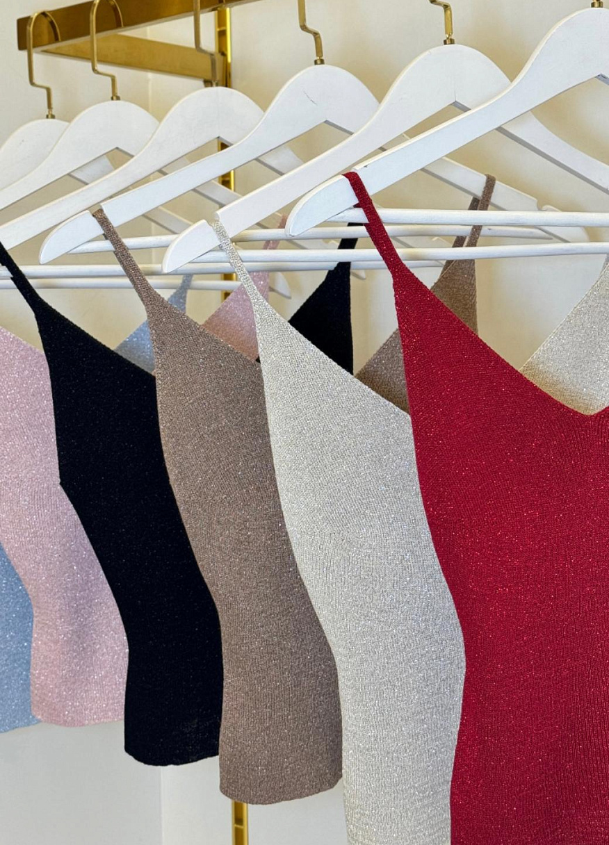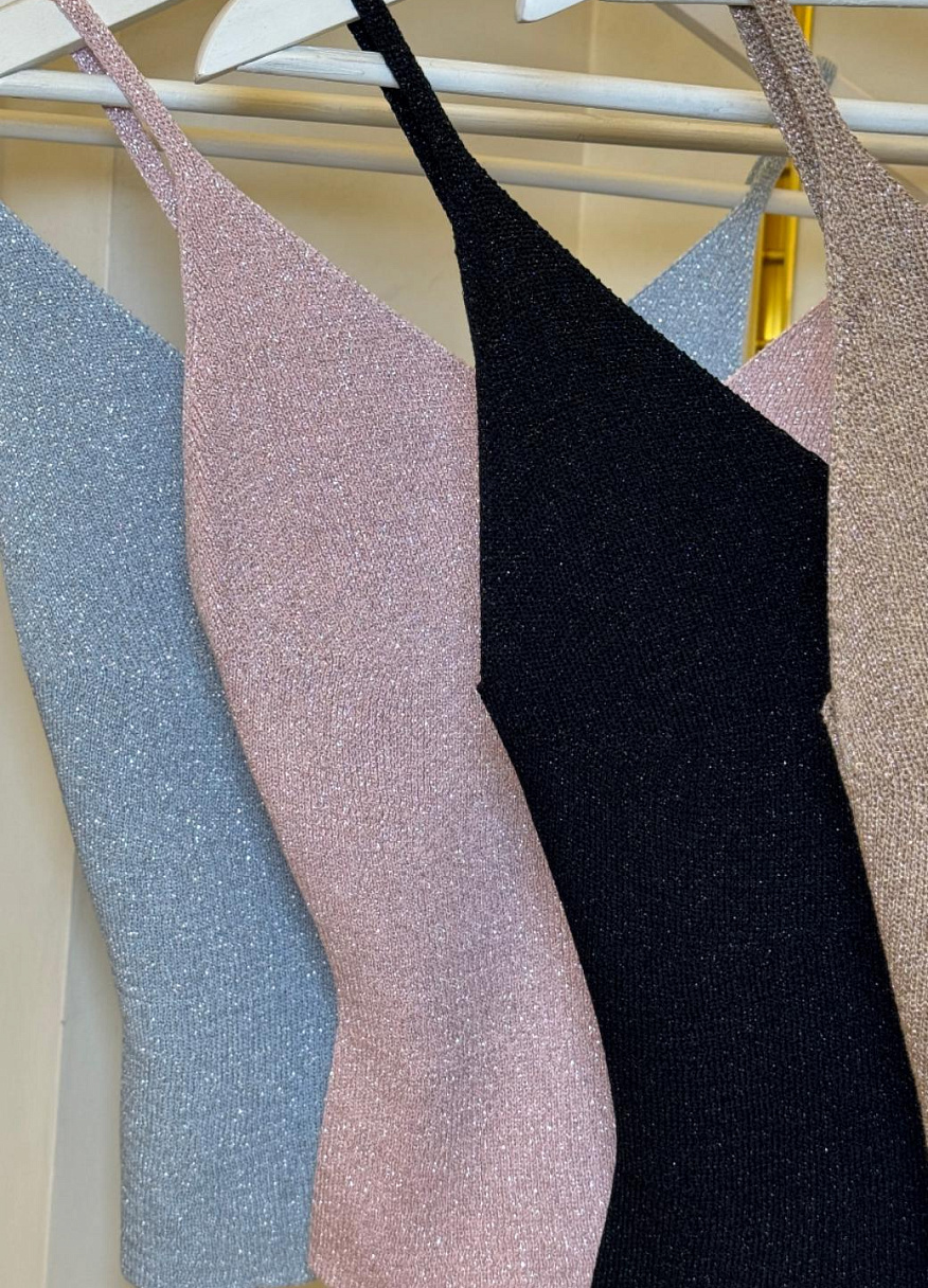 Ткань — мягкий трикотаж с блестящим люрексом. Он не сверкает, он мерцает: в утреннем свете — сдержанно, но очень элегантно, в вечернем — как россыпь звезд на небе. Этот блеск живой, но сдержанный. Он всегда в тему — и всегда в настроение.