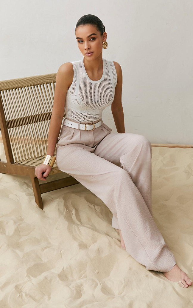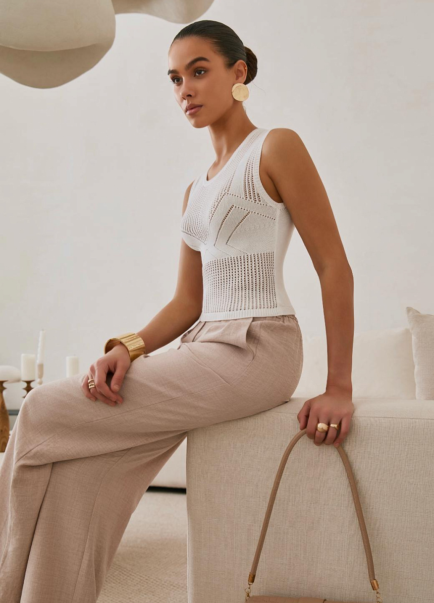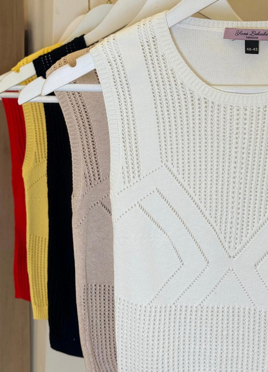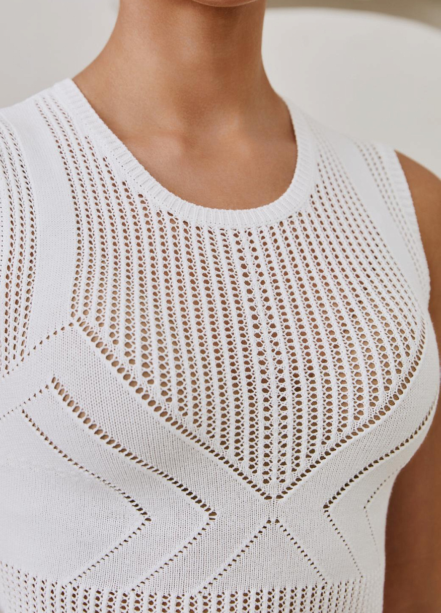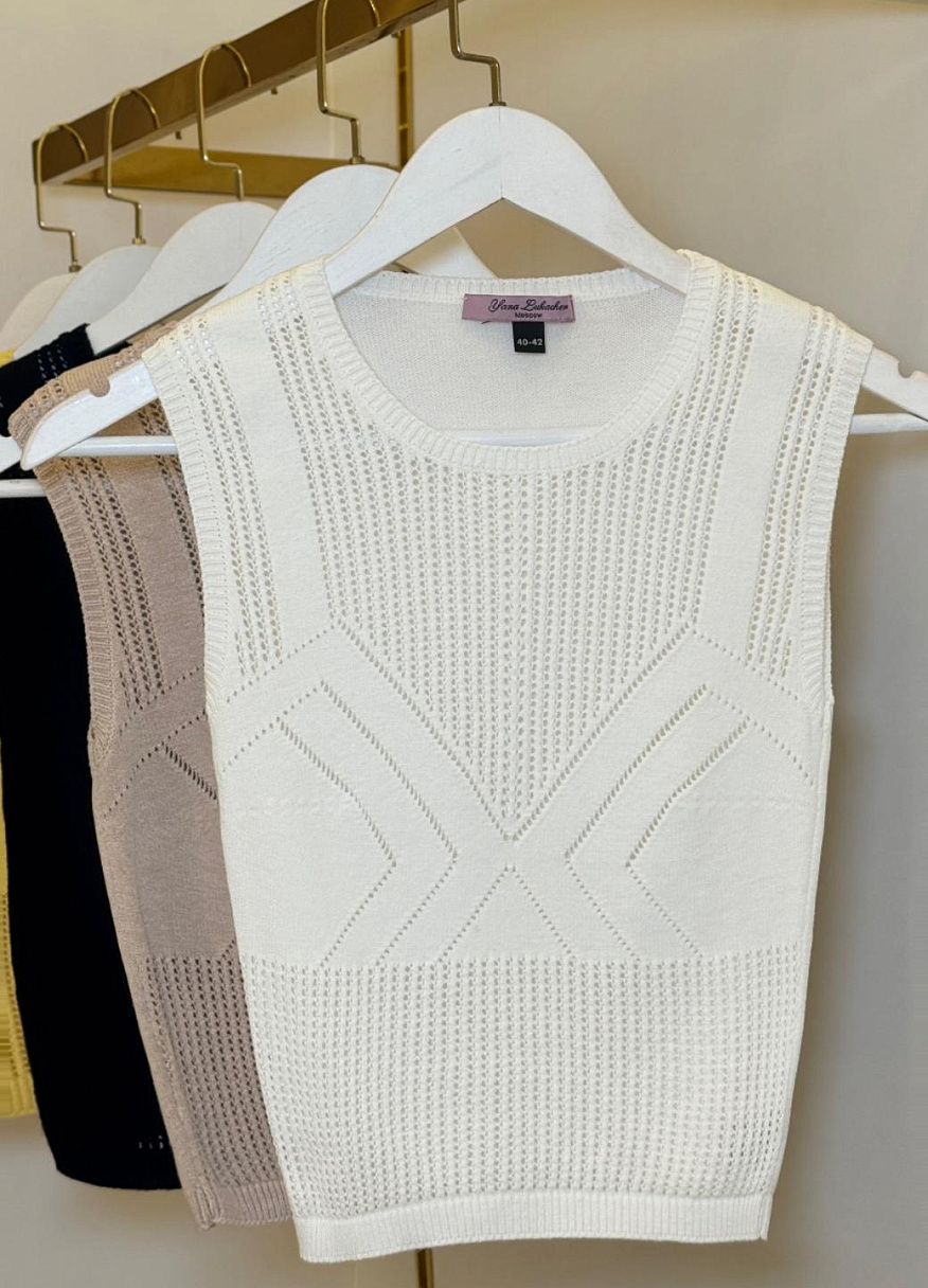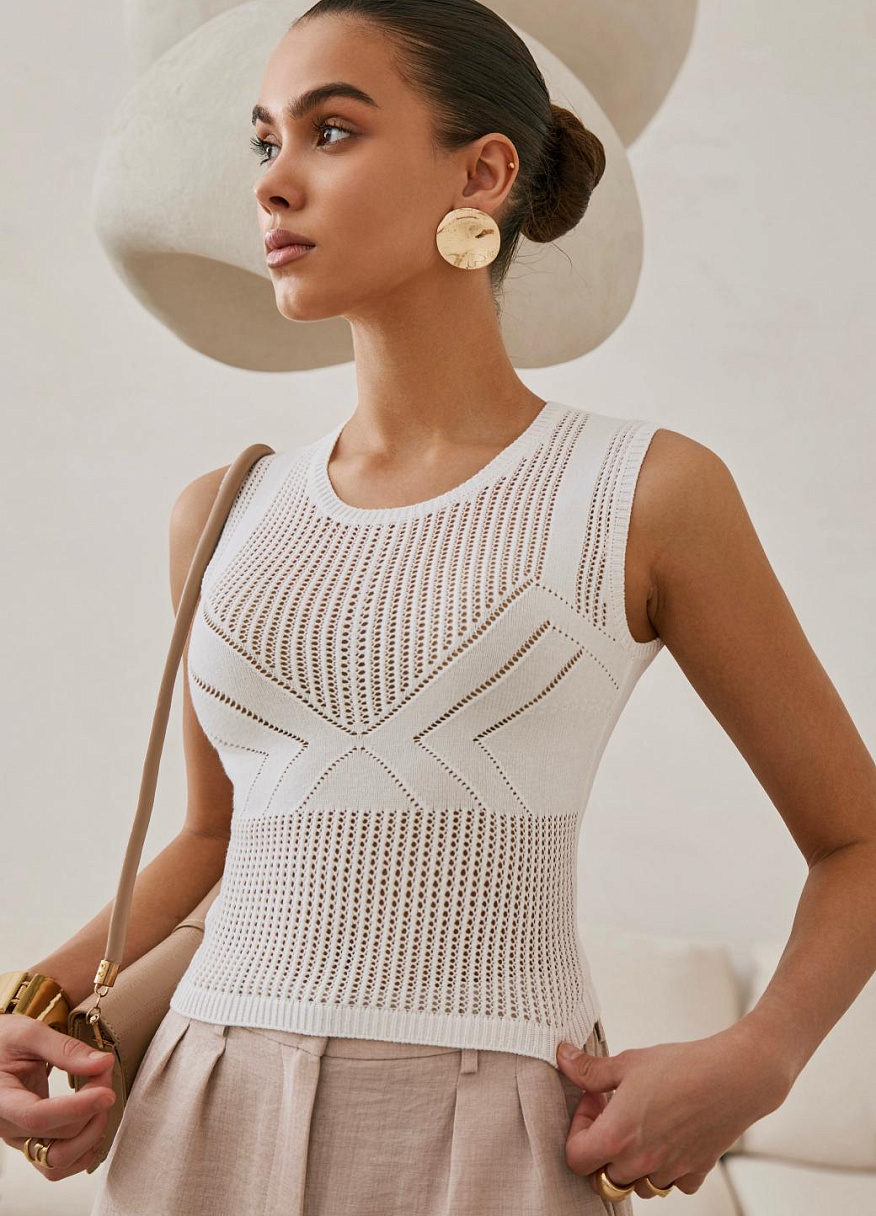 Главная интрига — имитация лифа, вплетённая прямо в узор. Без швов, без кроя — только тонкая игра текстур. Как будто топ знает форму тела заранее и подчёркивает её… между строк. Он не говорит напрямую — он намекает. В этом и есть его сила.