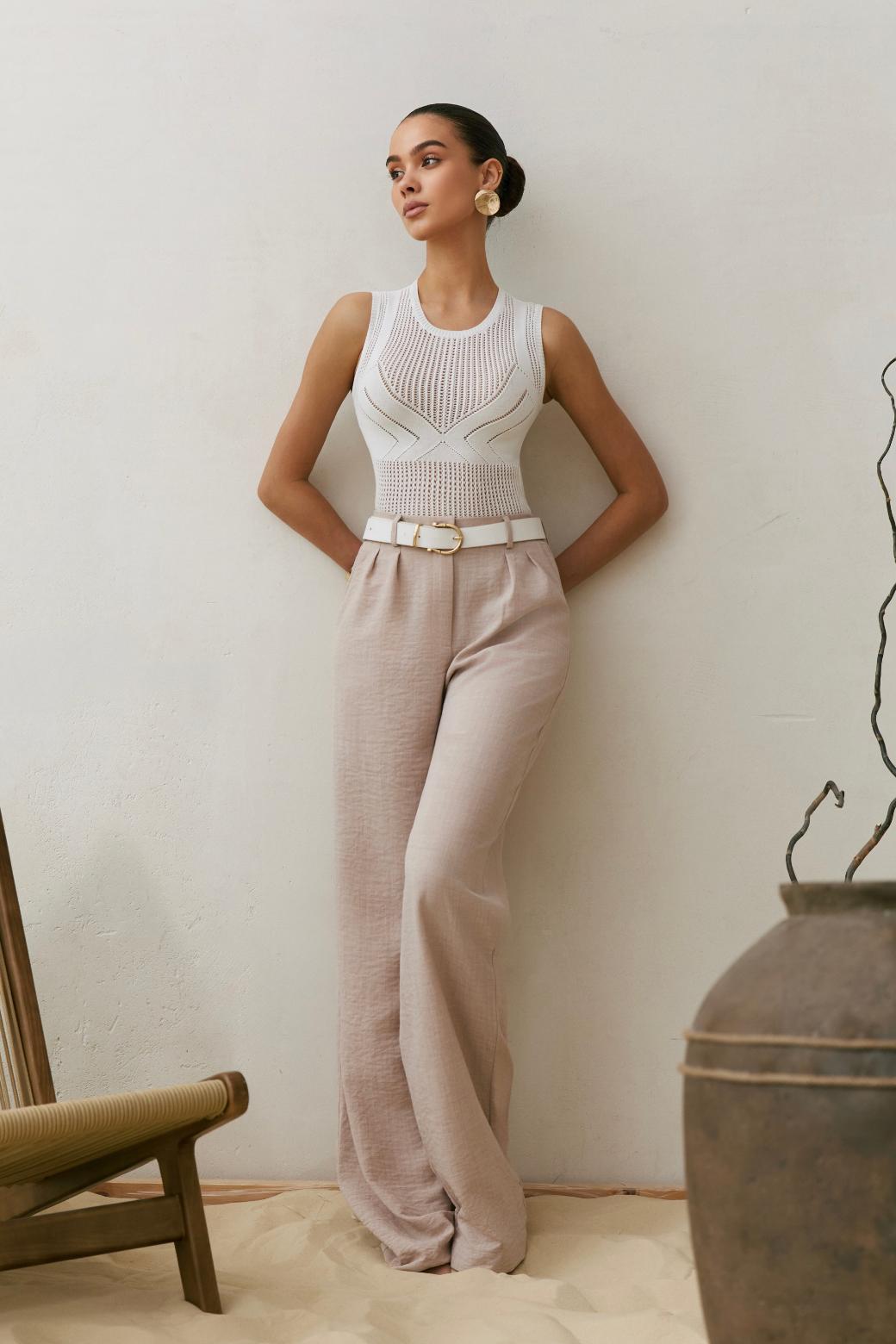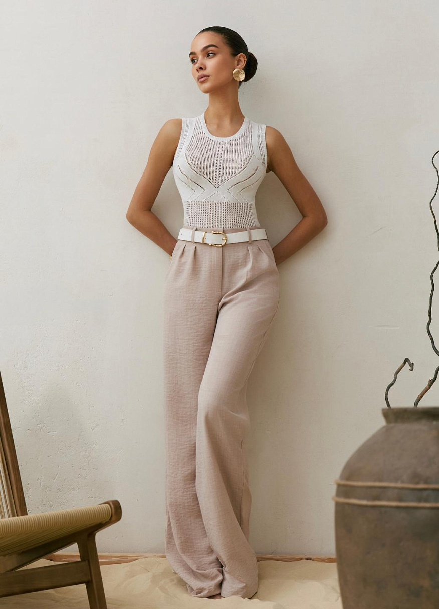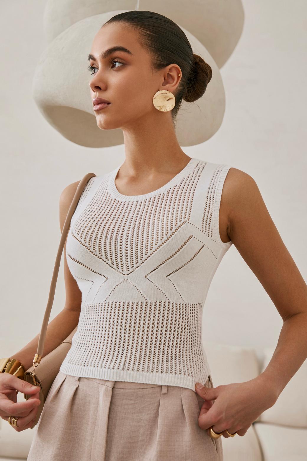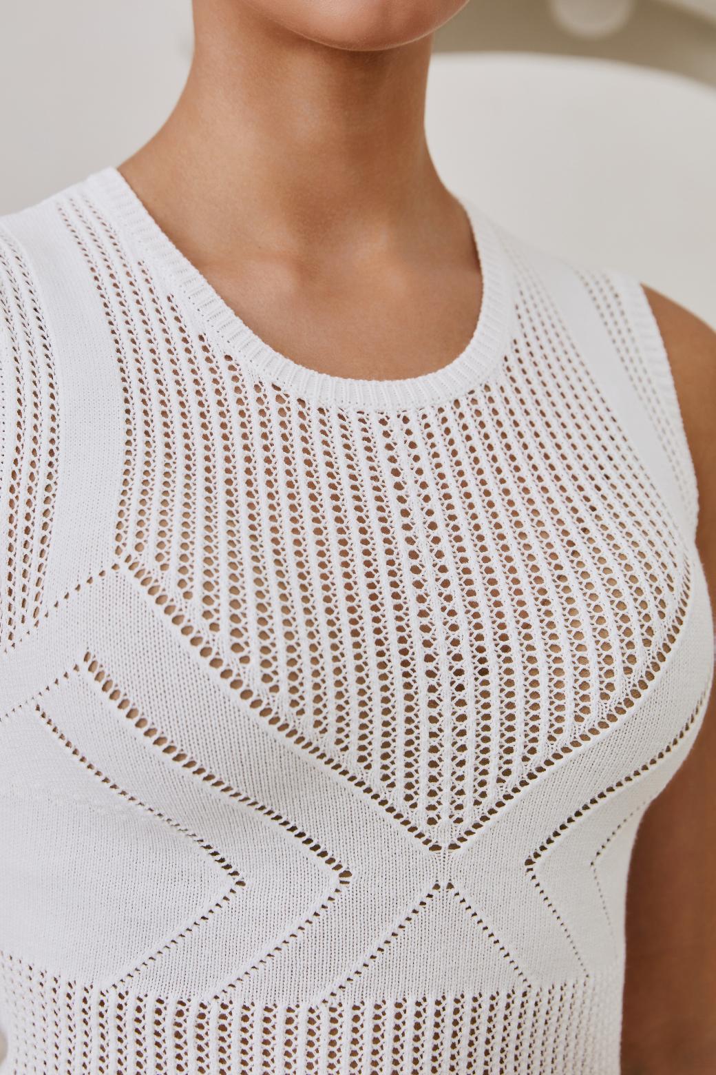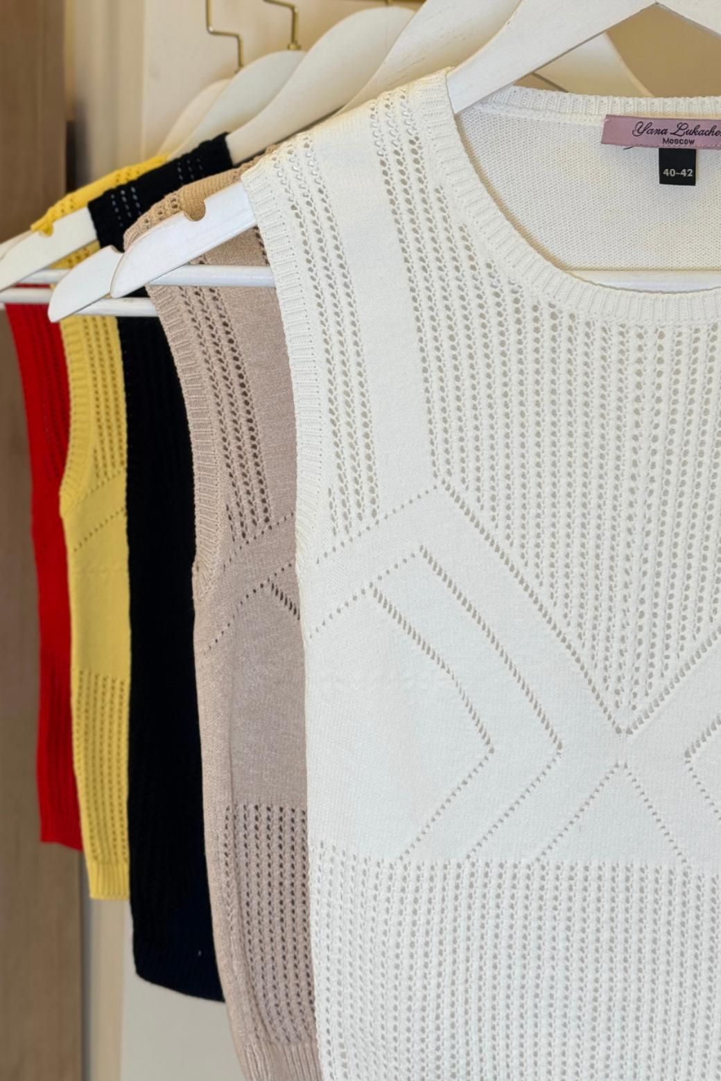Главная интрига — имитация лифа, вплетённая прямо в узор. Без швов, без кроя — только тонкая игра текстур. Как будто топ знает форму тела заранее и подчёркивает её… между строк. Он не говорит напрямую — он намекает. В этом и есть его сила.