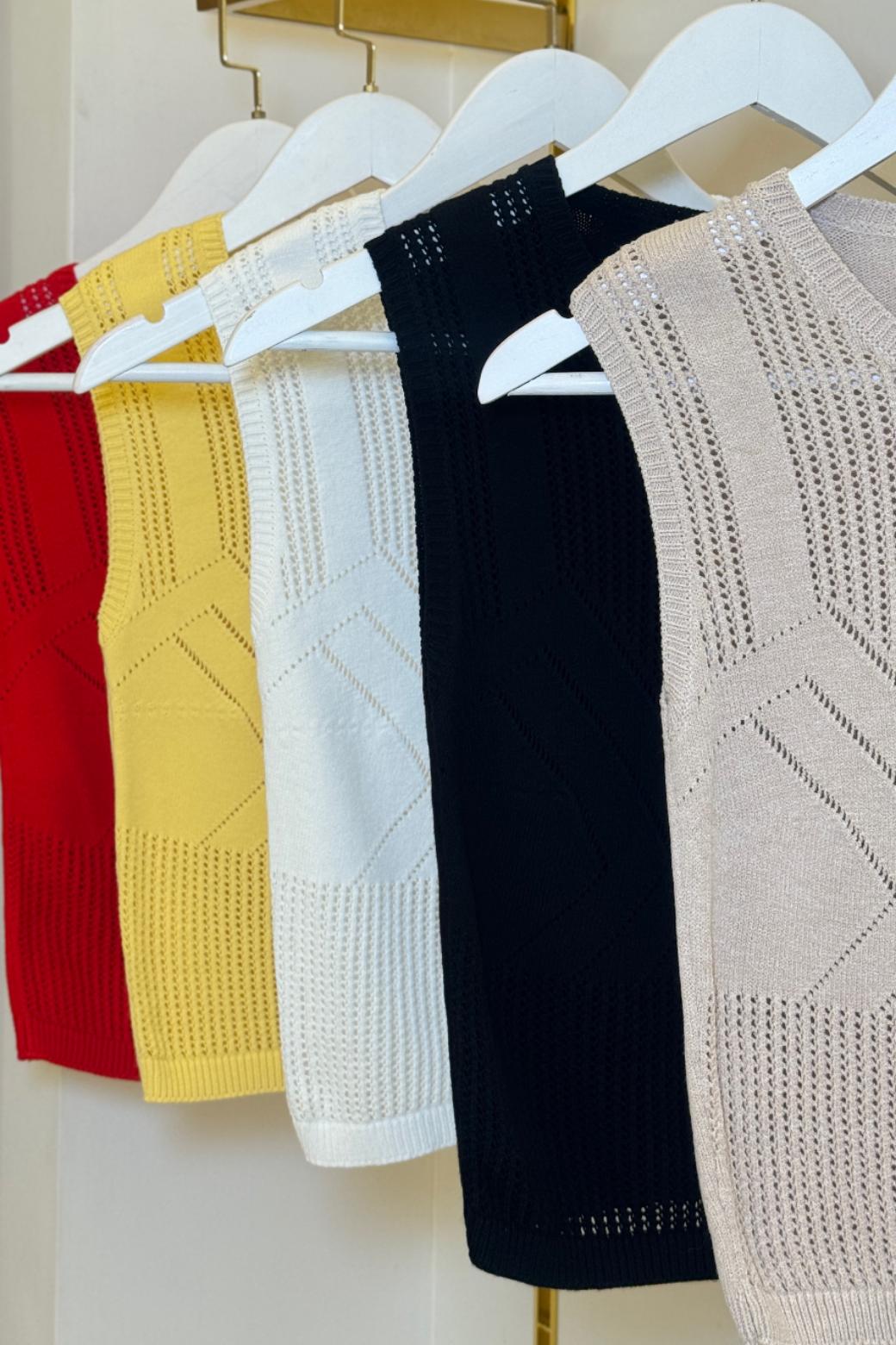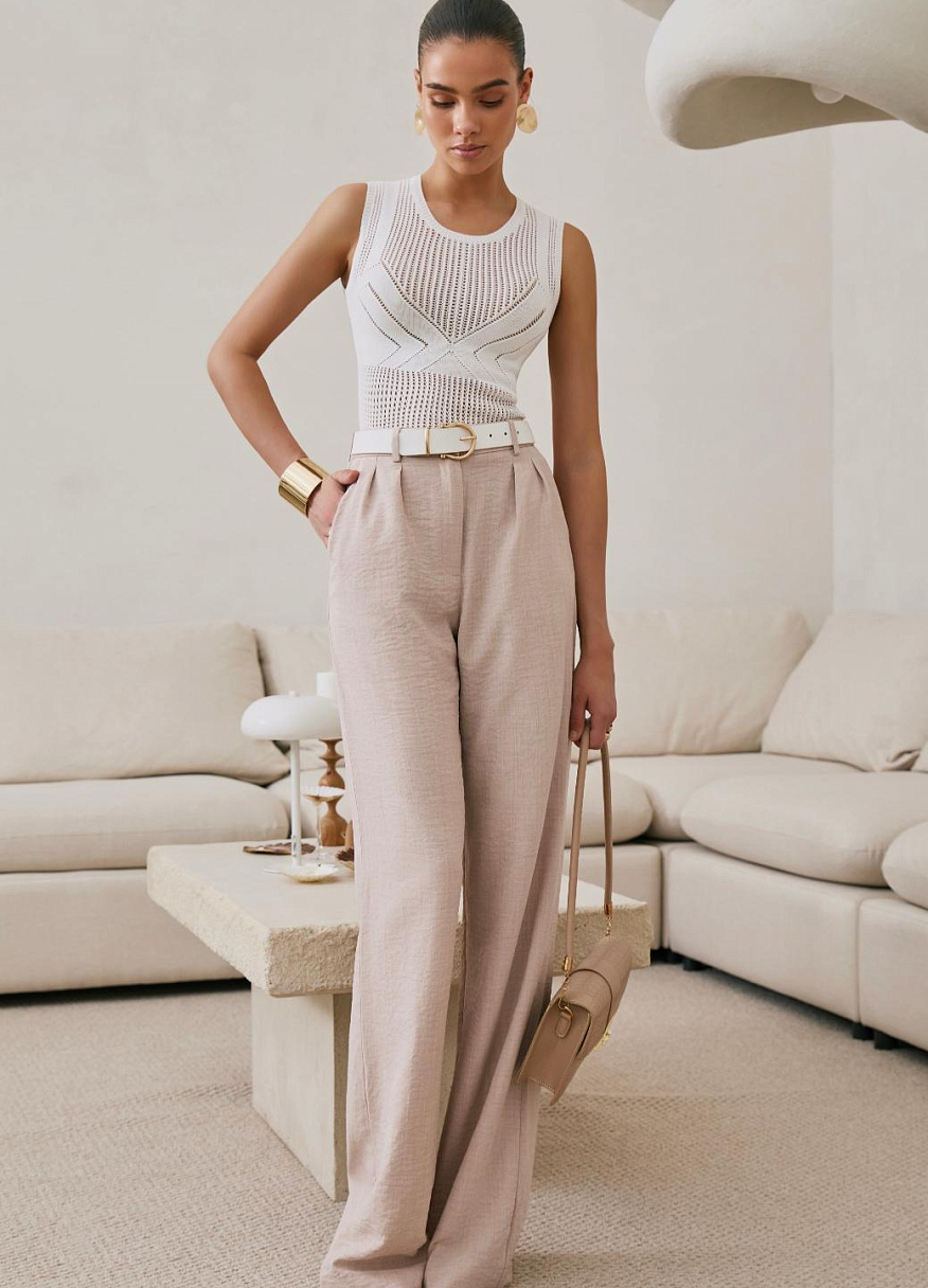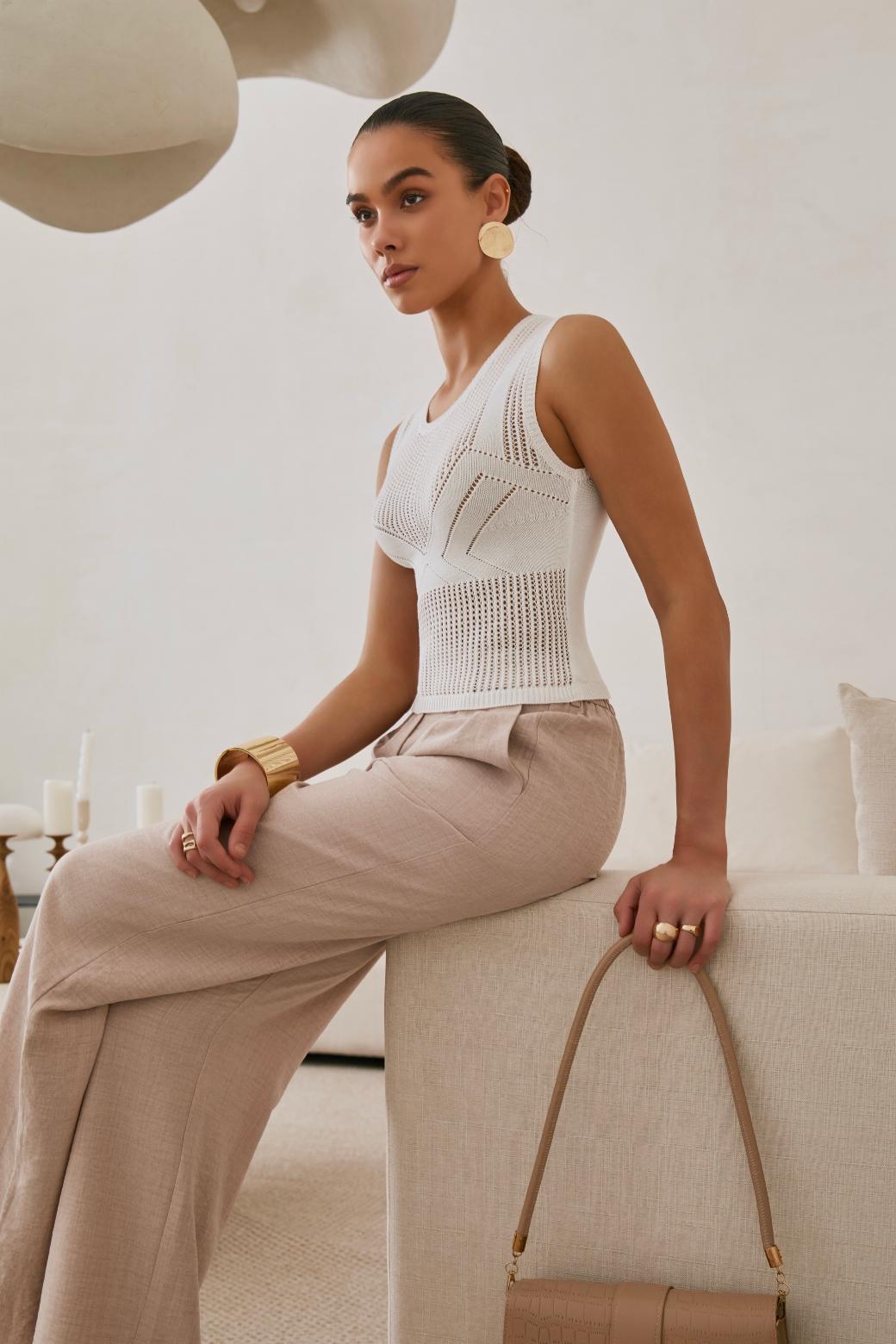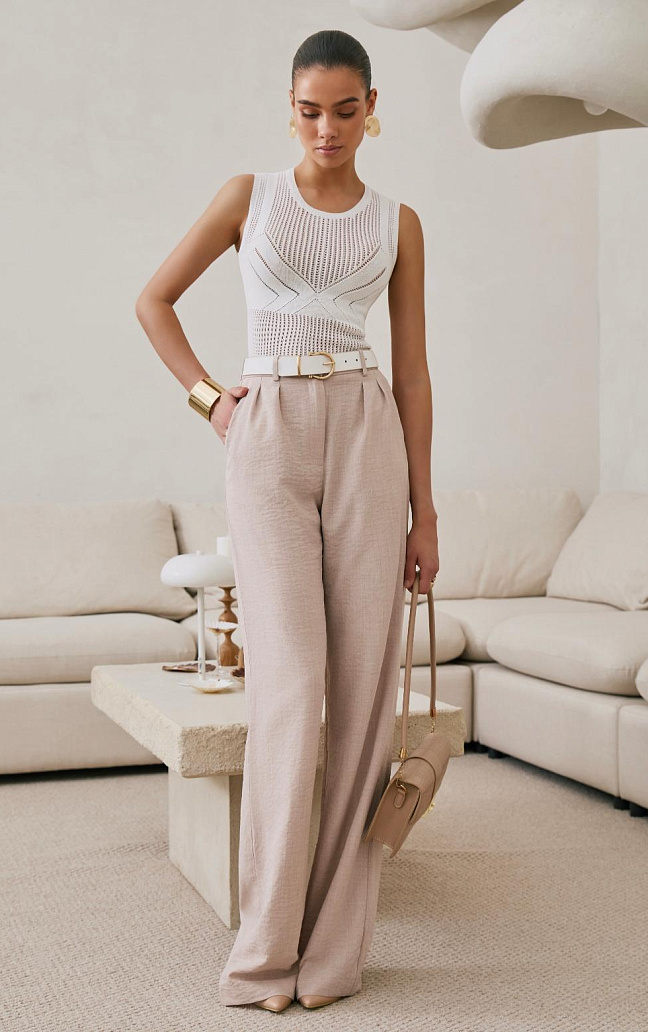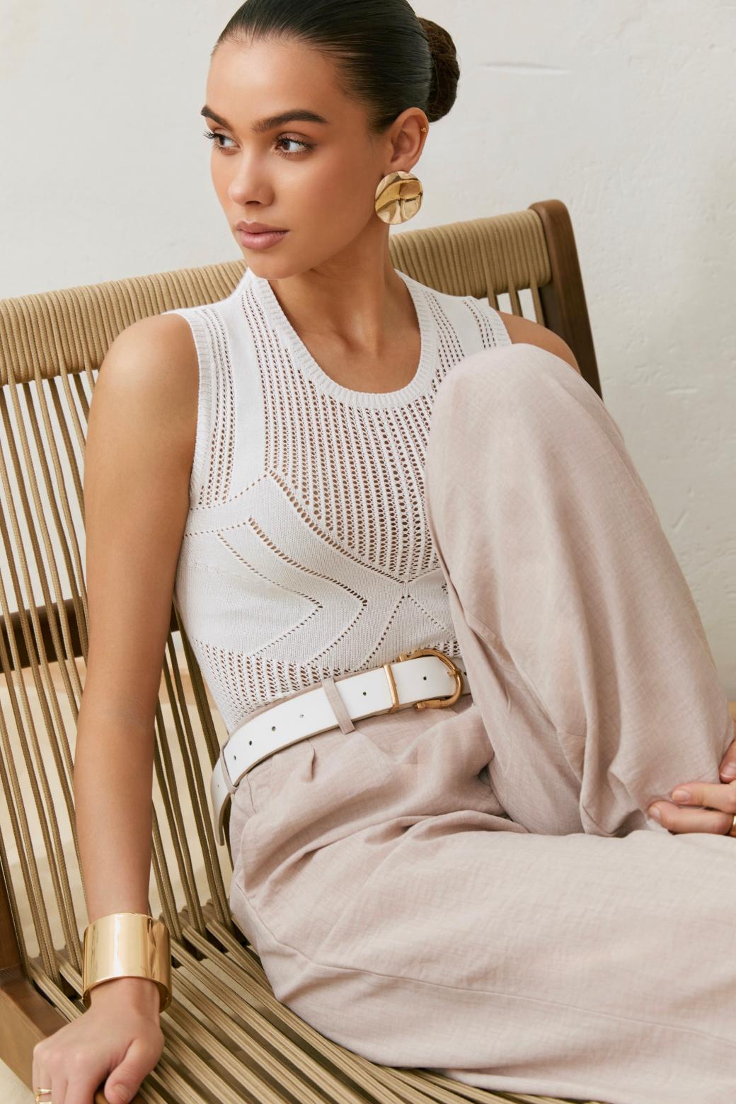 Главная интрига — имитация лифа, вплетённая прямо в узор. Без швов, без кроя — только тонкая игра текстур. Как будто топ знает форму тела заранее и подчёркивает её… между строк. Он не говорит напрямую — он намекает. В этом и есть его сила.