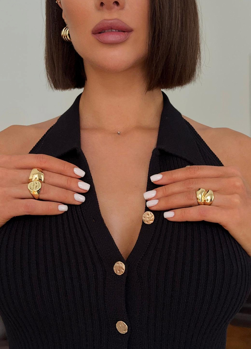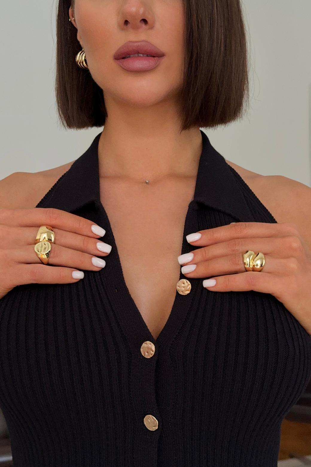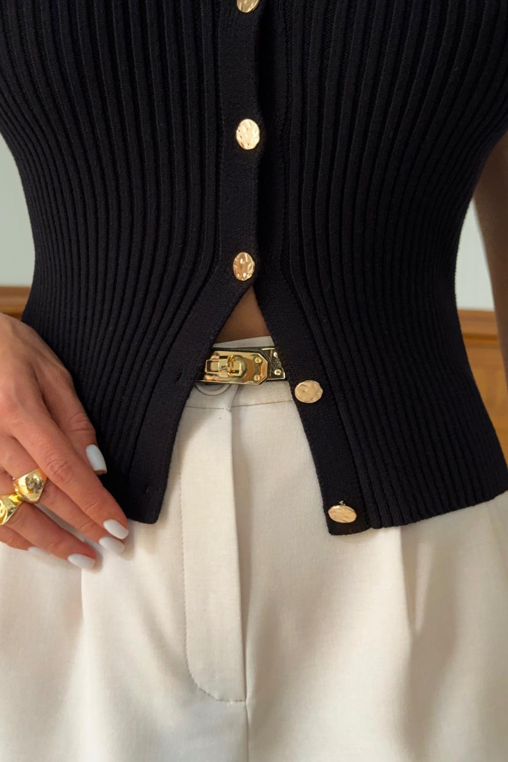 Золотые металлические пуговицы — не просто украшение, а функциональная деталь. Их можно расстегнуть сверху, подчёркивая линию декольте, или снизу — слегка приоткрывая пояс брюк. Или расстегнуть чуть сильнее, открывая ровно столько, сколько хочется? Всё зависит от ситуации — хотите элегантности или лёгкой провокации? Выбирайте сами.