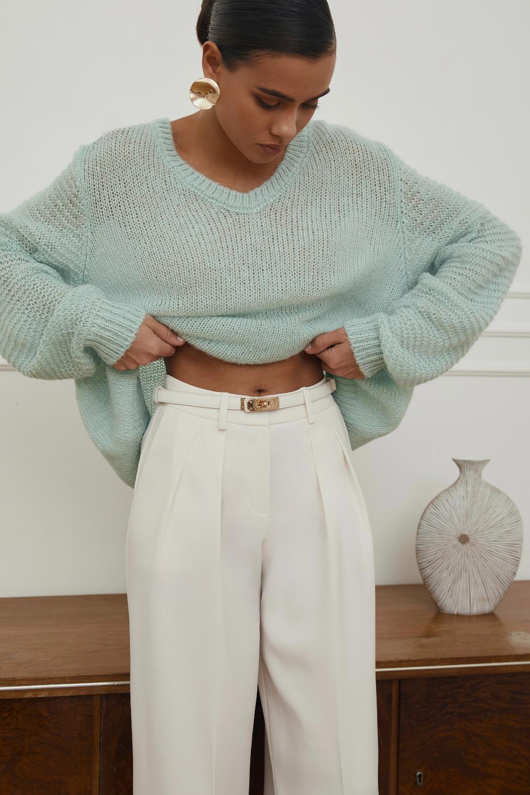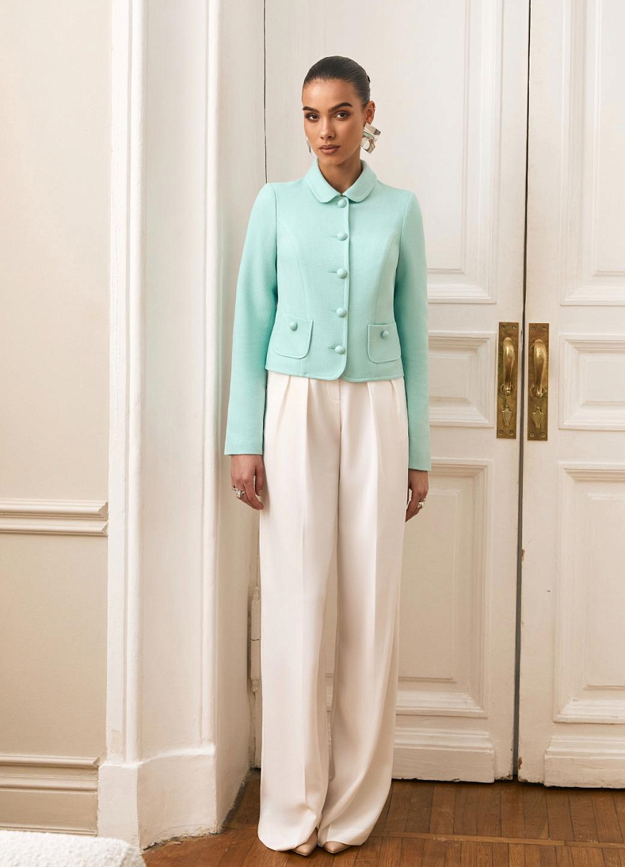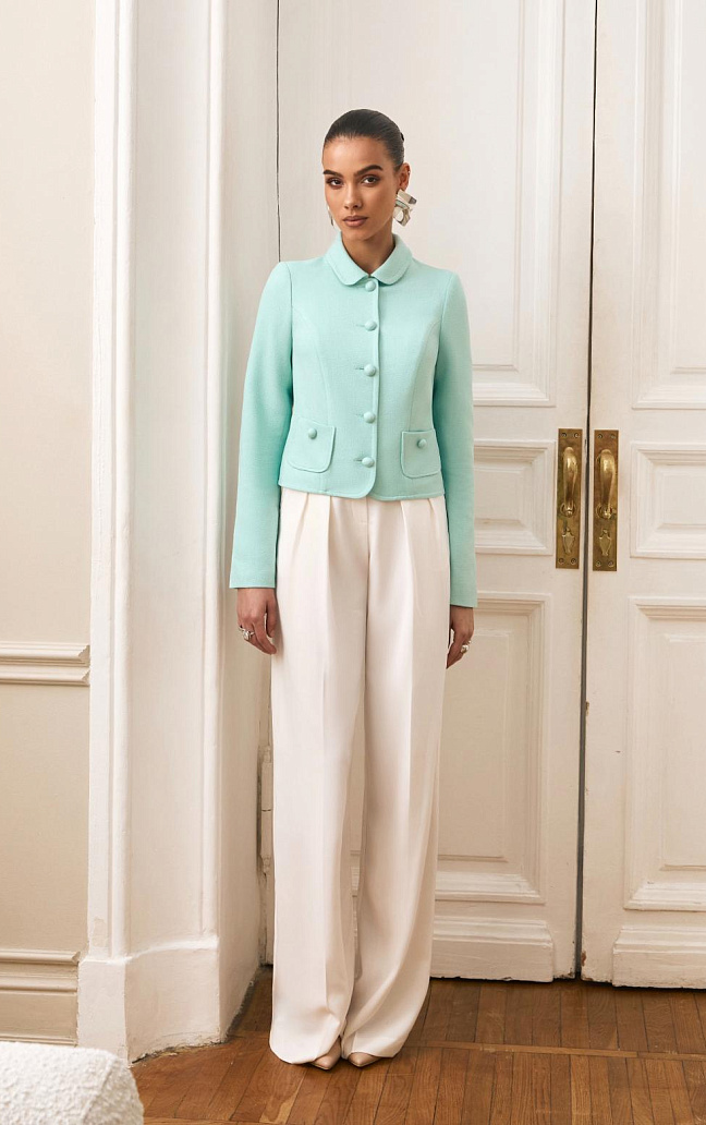 Элегантные брюки «Уолл-стрит» с первой примерки влюбляют строгостью своих линий. Они выполнены из гладкой, легкой и матовой костюмной ткани, отличающейся особой пластичностью и функциональностью. Изделие имеет высокую посадку, акцентирующую талию, гипертрофированно расклешенный крой и глубокие складки, формирующие приталенный выразительный силуэт. Брюки застегиваются с помощью брючной молнии и крючков.