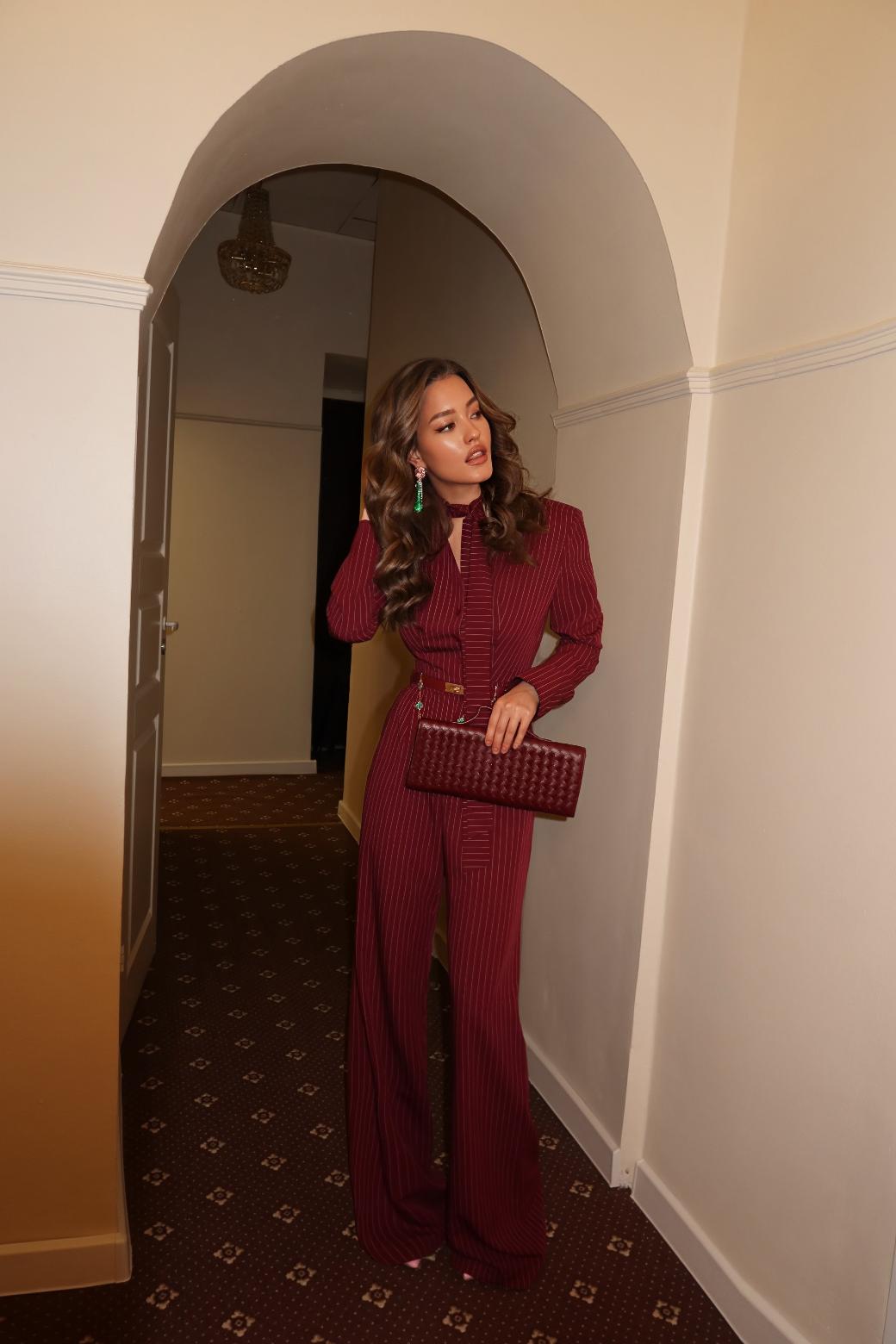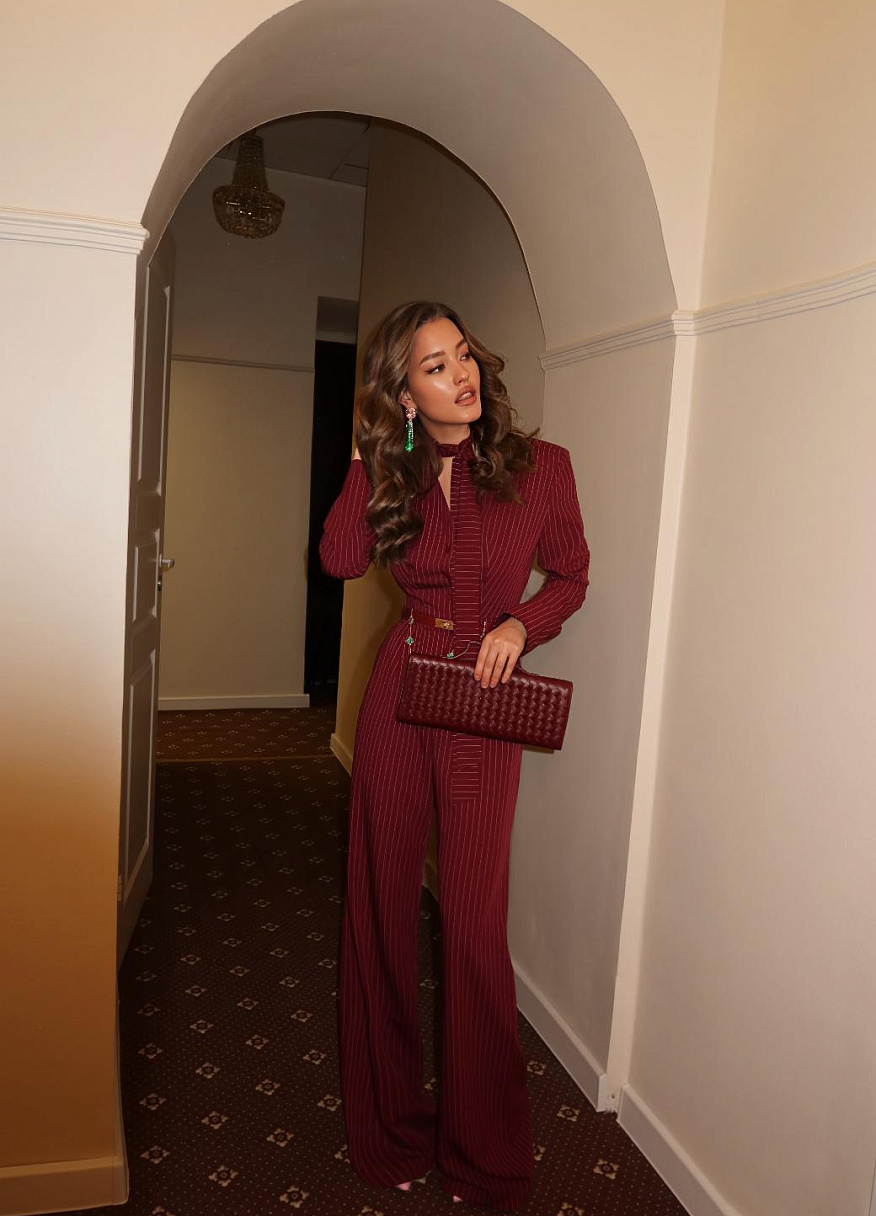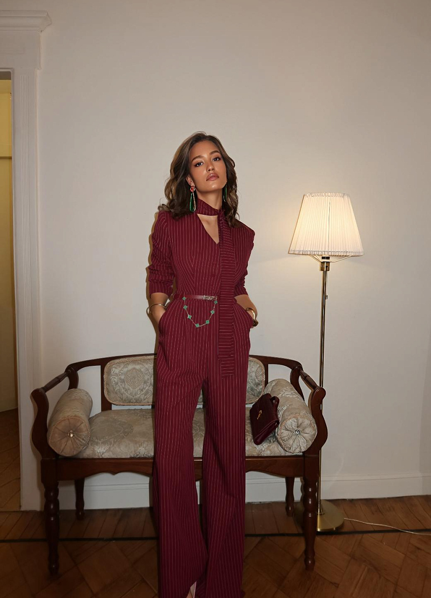 Днем «Тео» идеален для офиса или деловой встречи, а вечером превращается в нарядный комбинезон, в образ, который заметят. Он также отлично подходит как комбинезон на Новый год — женский комбинезон, который сочетает удобство, стиль и элегантность одновременно. Каждый его элемент продуман так, чтобы ощущение роскоши и гармонии было заметно с первого взгляда.