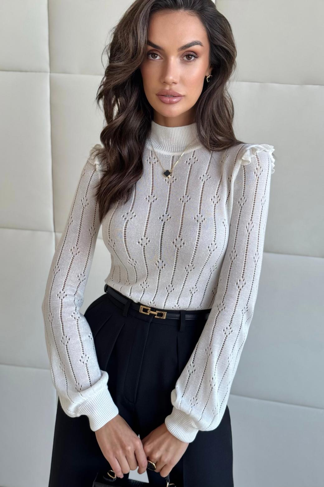 Каждое прикосновение к ткани свитера «Россини» – это как легкое касание волшебства. Искусно провязанная перфорация в виде падающих звезд превращает его в фееричное произведение, которое словно окутывает вас атмосферой загадки и очарования. Воротник-стойка и объемные рукава с изысканными оборками по окату не просто дополняют, а подчеркивают вашу аристократическую натуру, превращая каждый ваш шаг в шаг королевы.