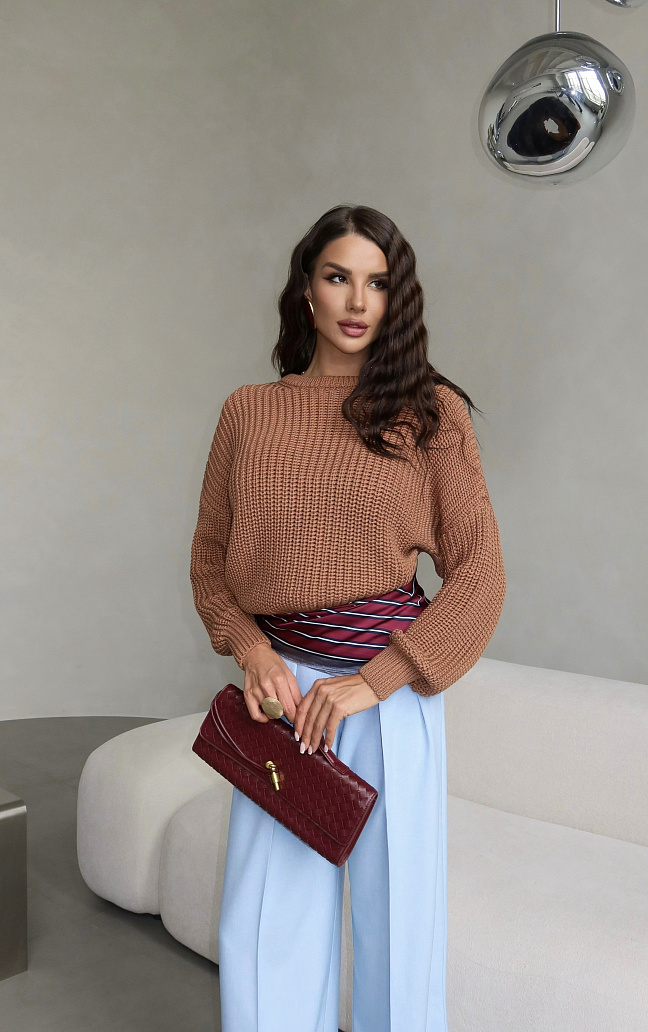 Объёмный, воздушный силуэт придает образу непринуждённую грацию и безмятежность. В этом свитере вы всегда будете в центре внимания, привлекая взгляды и вызывая восхищение.