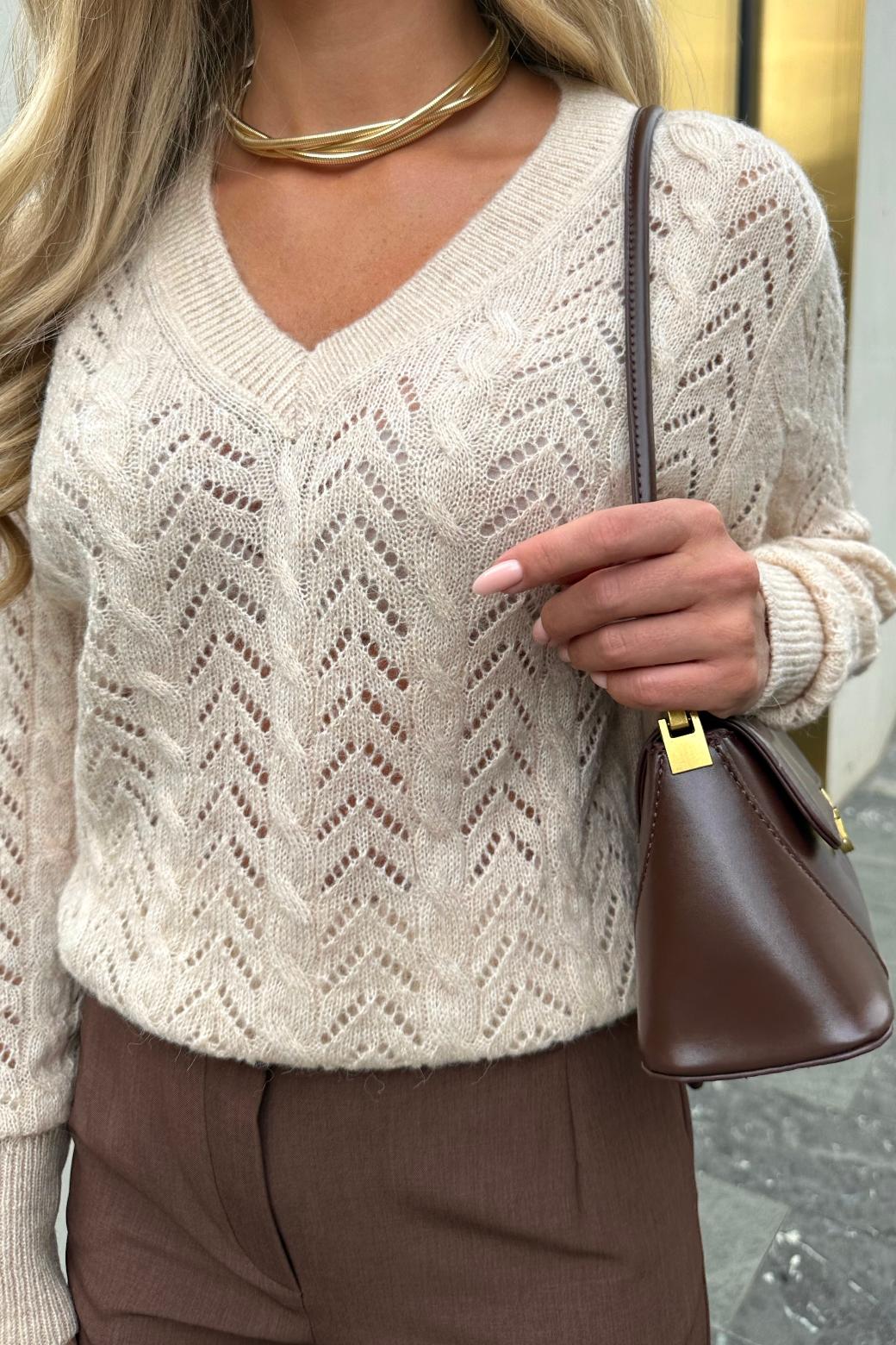 «Мелроуз» завораживает с первого взгляда. Его великолепный узор, сочетающий ажурные косы в виде елочки и элегантные жгуты, создает эффектный визуальный акцент, который мгновенно привлекает внимание. Каждая петля и перекрещивание свидетельствуют о высочайшем мастерстве и внимании к деталям, что делает этот свитер настоящим произведением искусства.