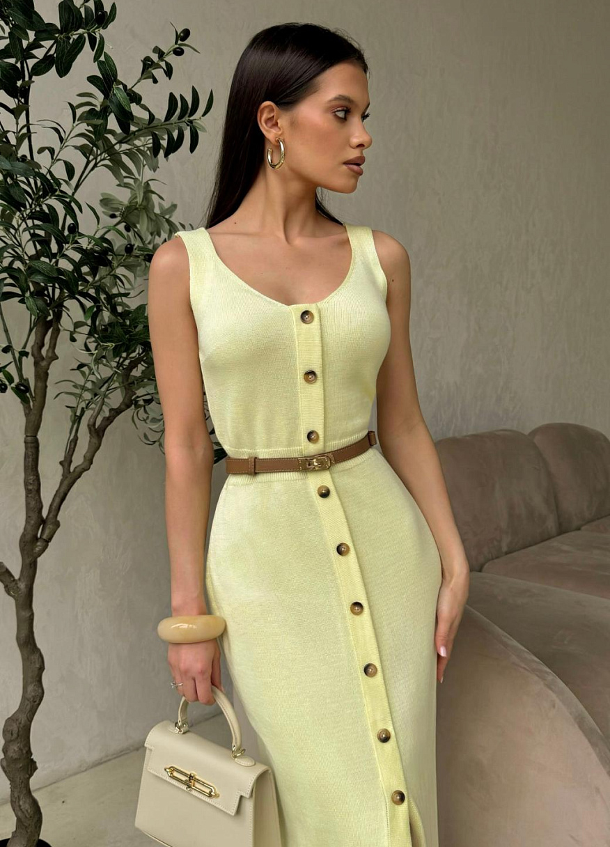 Чувственное платье «Селестия» создано для того, чтобы Вы покорили всех своим внешним видом. Модель выполнена из невероятно мягкой и приятной к телу пряжи с хлопком в составе, что придает ему особую легкость и шелковистость. Изделие имеет полуприлегающий крой, который выгодно подчеркивает и моделирует изящный женственный силуэт. А застежка на ряд контрастных пуговиц спереди создает дополнительную вертикаль, что визуально стройнит фигуру.