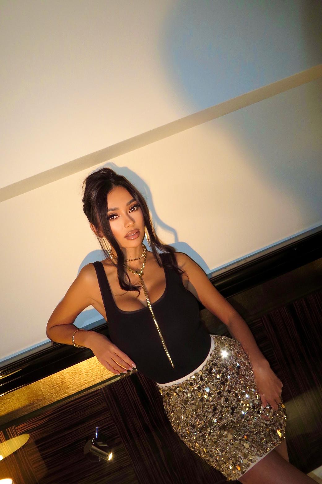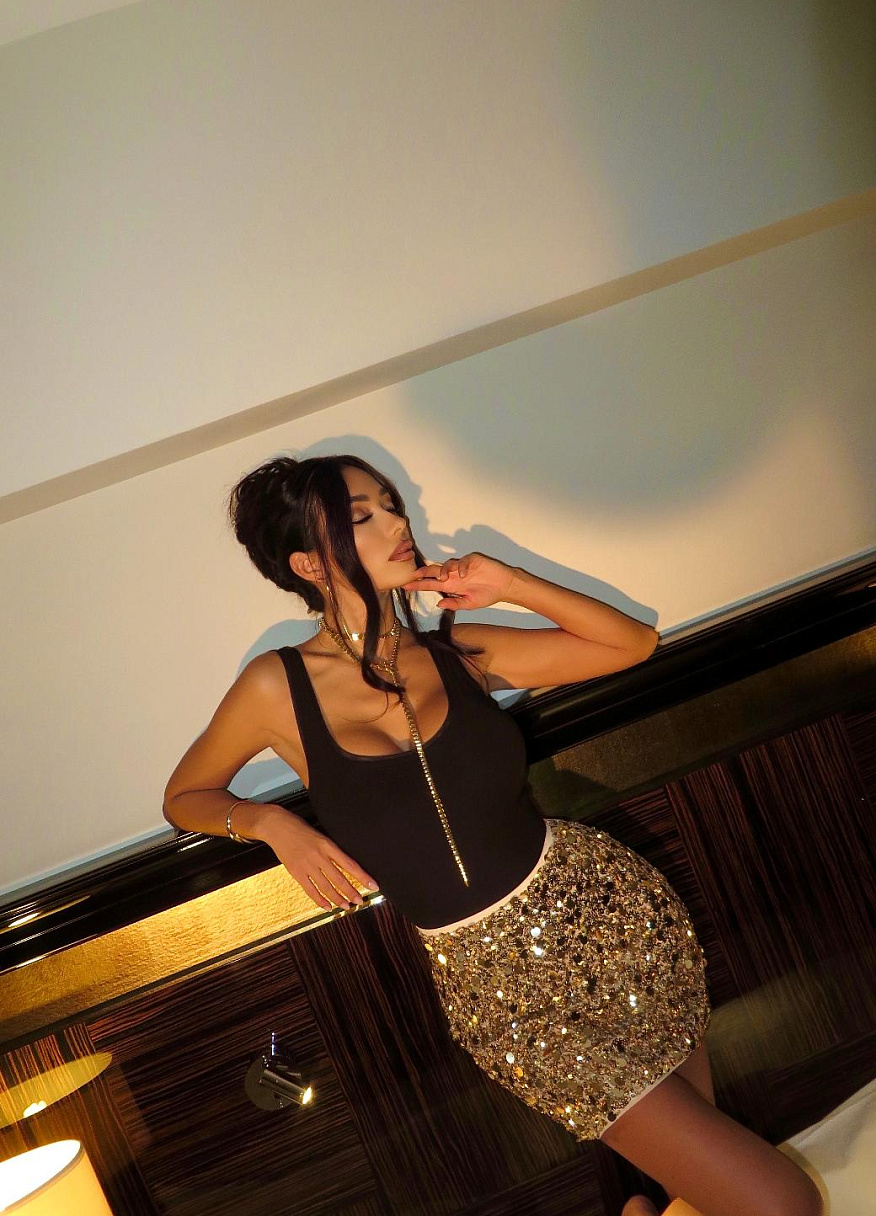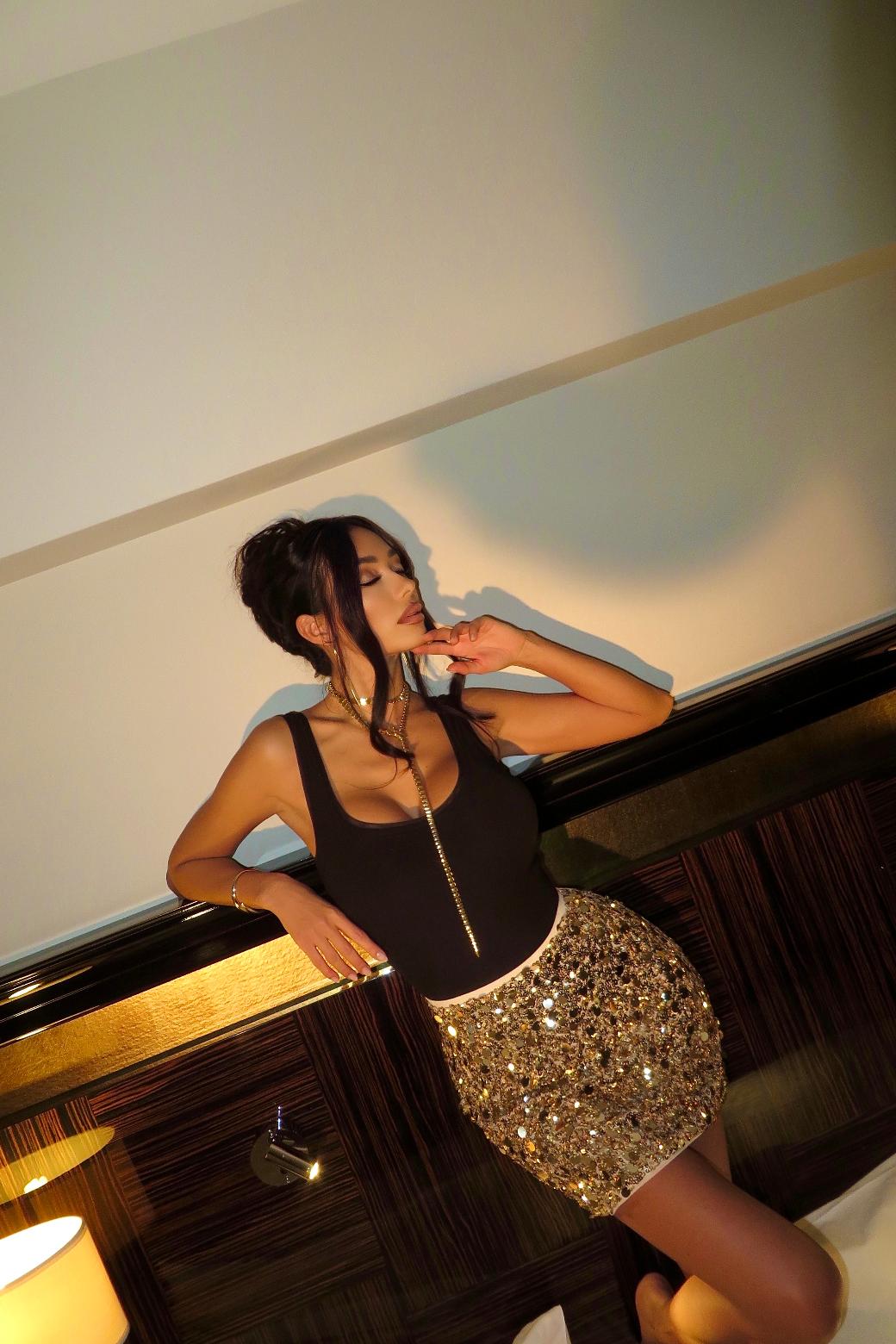 Нарядная юбка мини создана для того, чтобы вы сияли. Сияли не только внешне — изнутри. Её поверхность переливается сотнями бликов. В ней каждый шаг — как вспышка, каждое движение — как маленький фейерверк.