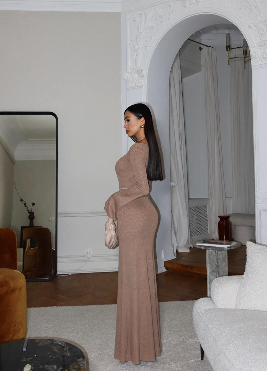 Юбка отвечает на каждое ваше движение, создавая эффект грации и лёгкости. Чтобы достичь такой пластики и идеального расклешения, мастерам потребовались часы кропотливой работы. Каждая петля, каждая сбавка исполнены с предельной точностью, чтобы вы чувствовали себя роскошно и непревзойдённо.