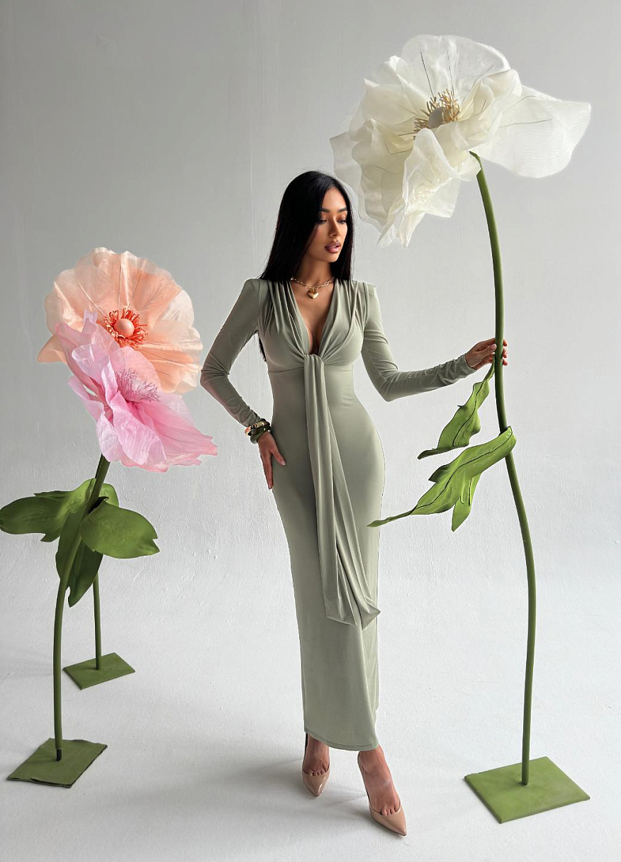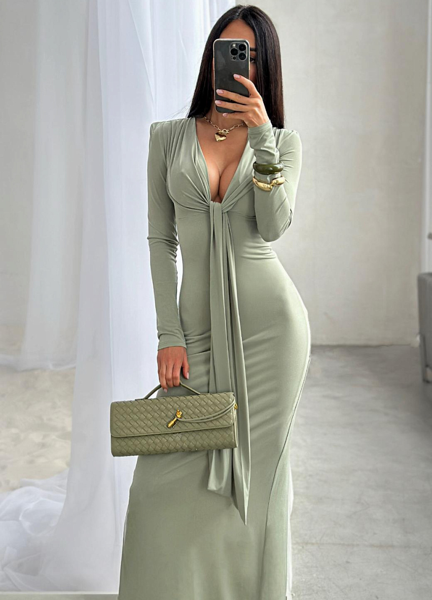 Оно не просто подчёркивает фигуру, а делает это с исключительной деликатностью: мягкий эластичный трикотаж в сочетании с подкладкой скользит по телу, скрывая мелкие недостатки и подчёркивая главное — женственность. Лиф с глубоким V-образным вырезом украшен элегантной драпировкой, переходящей в удлиненные концы, которые можно завязать в виде галстука или даже банта. Именно они превращают платье в инструмент для игры: затяните их потуже, придав образу загадочности, или ослабьте, чтобы усилить эффект соблазнительности. Эта деталь делает платье «Анора» невероятно универсальным — оно может быть разным, но всегда останется безупречным.