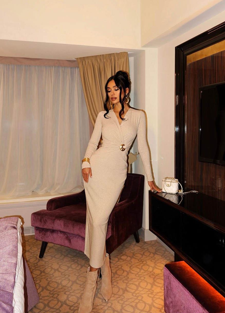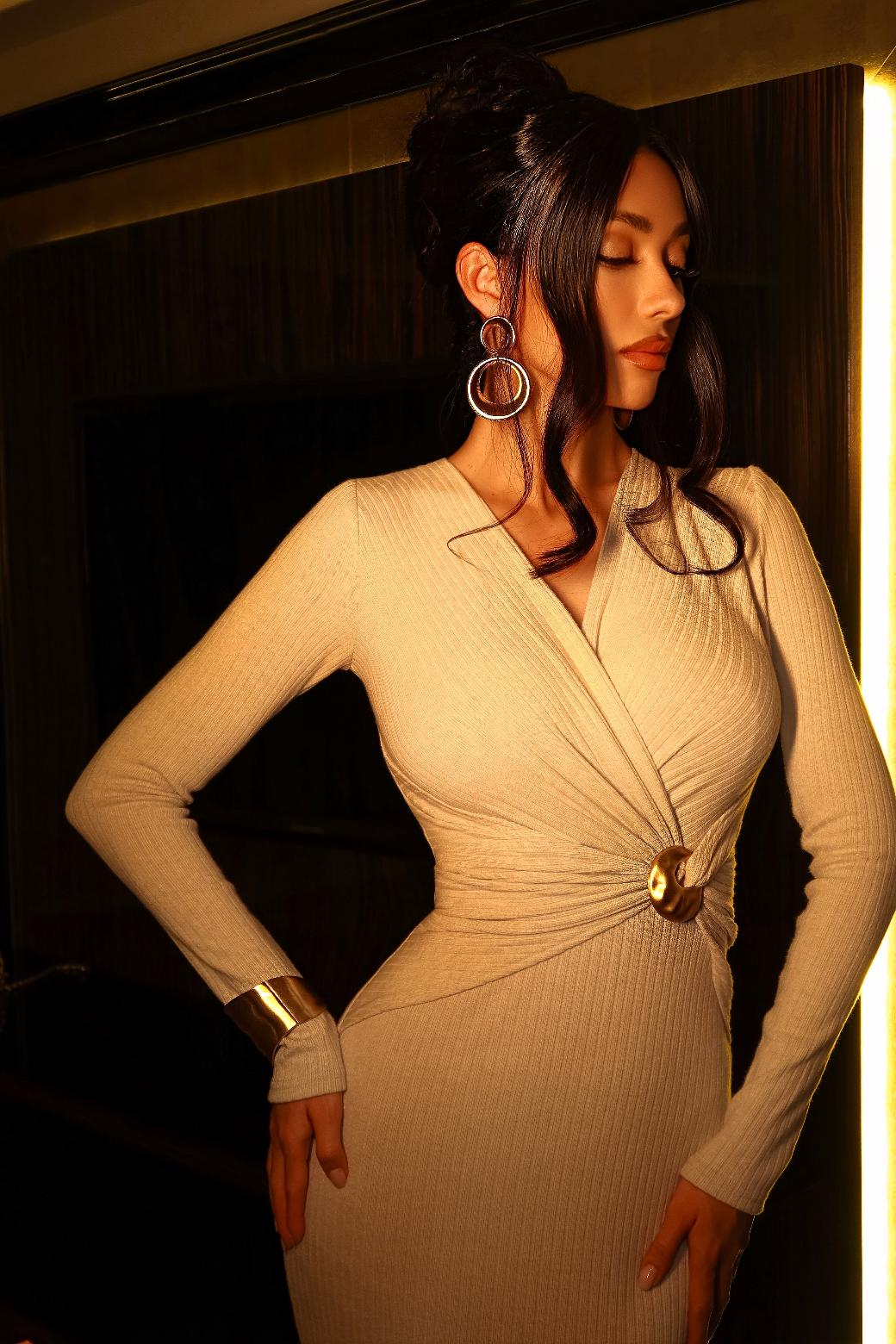 Золотая пряжка на талии становится акцентом, словно ювелирная деталь, которая держит драпировку и завершает безупречный образ. Глубокий, но элегантный запах делает вырез соблазнительным, не переходя границ изысканности.