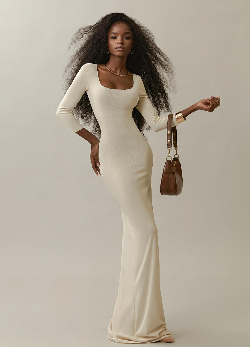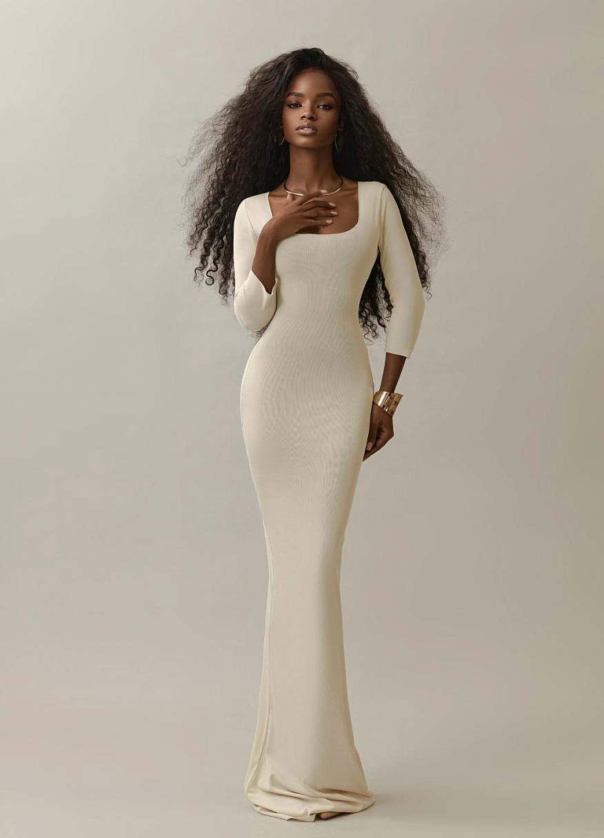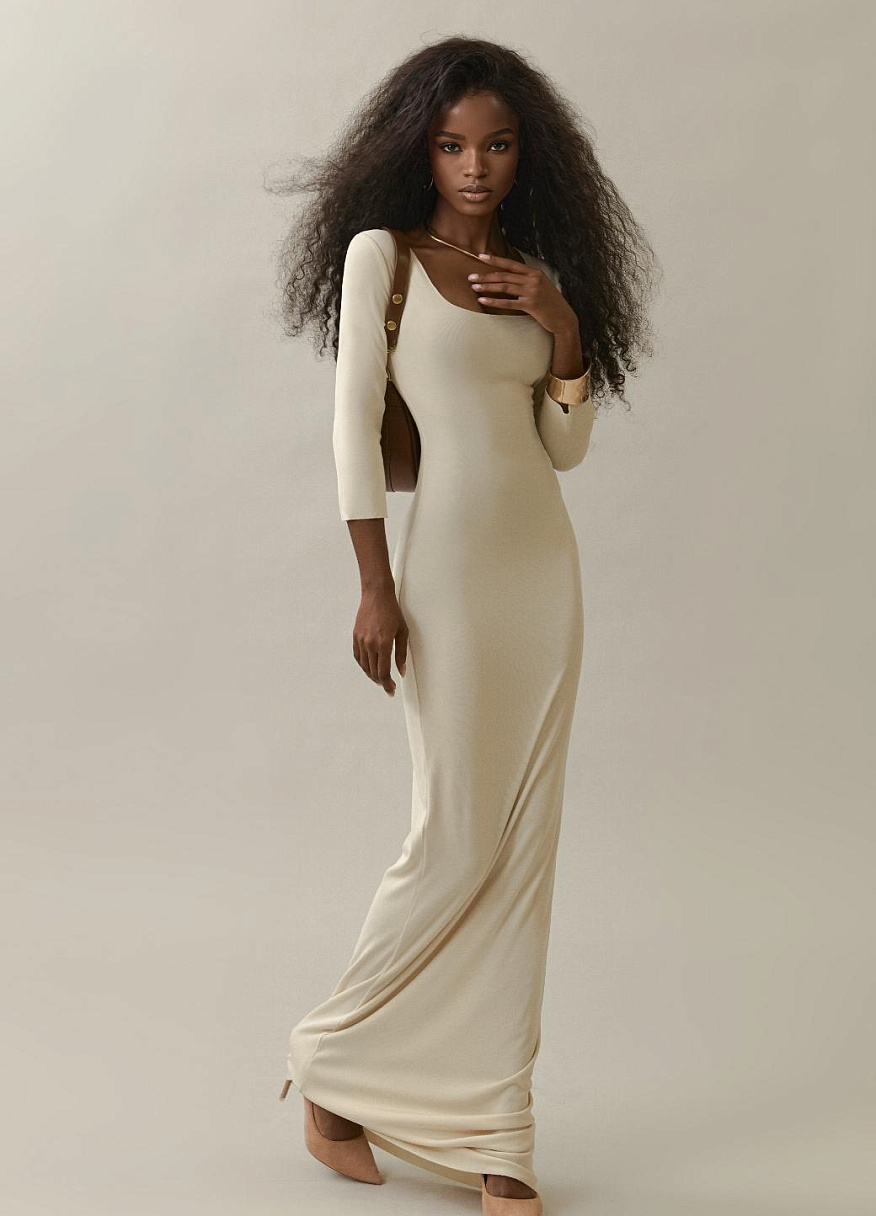 Элегантный вырез и рукава 3/4, подчеркнутые оригинальностью, делают модель ещё более утончённой и женственной. Но главное — это возможность изменить длину платья под ваш рост и обувь, придавая образу невероятную гибкость и индивидуальность. Вы — художник своего стиля, а это платье — холст для самых смелых экспериментов.