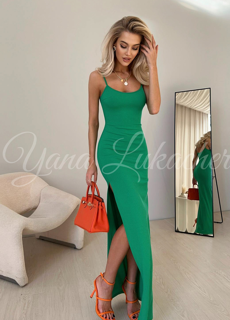 В чем формула безупречности изысканного платья «Хелена»? Все гениальное просто: лаконичный крой, трендовая длина и комфортный материал. Изделие выполнено из нежного, мягкого и эластичного трикотажного полотна, а текстура в вертикальную полоску очень выгодно подчеркивает женские формы. Соблазнительный прилегающий крой акцентирует внимание на красивых изгибах женского силуэта, а тонкие бретели позволяют продемонстрировать хрупкость плеч и изящество женского декольте. Открытый верх модели нивелируется макси длиной, которая уже завоевала звание одного из главных трендов. Юбку также дополняет высокий боковой разрез, который деликатно приоткрывает ноги и визуально добавляет роста.