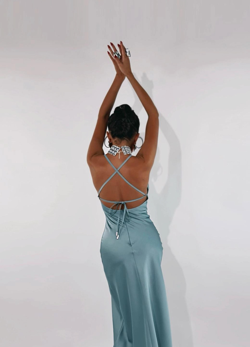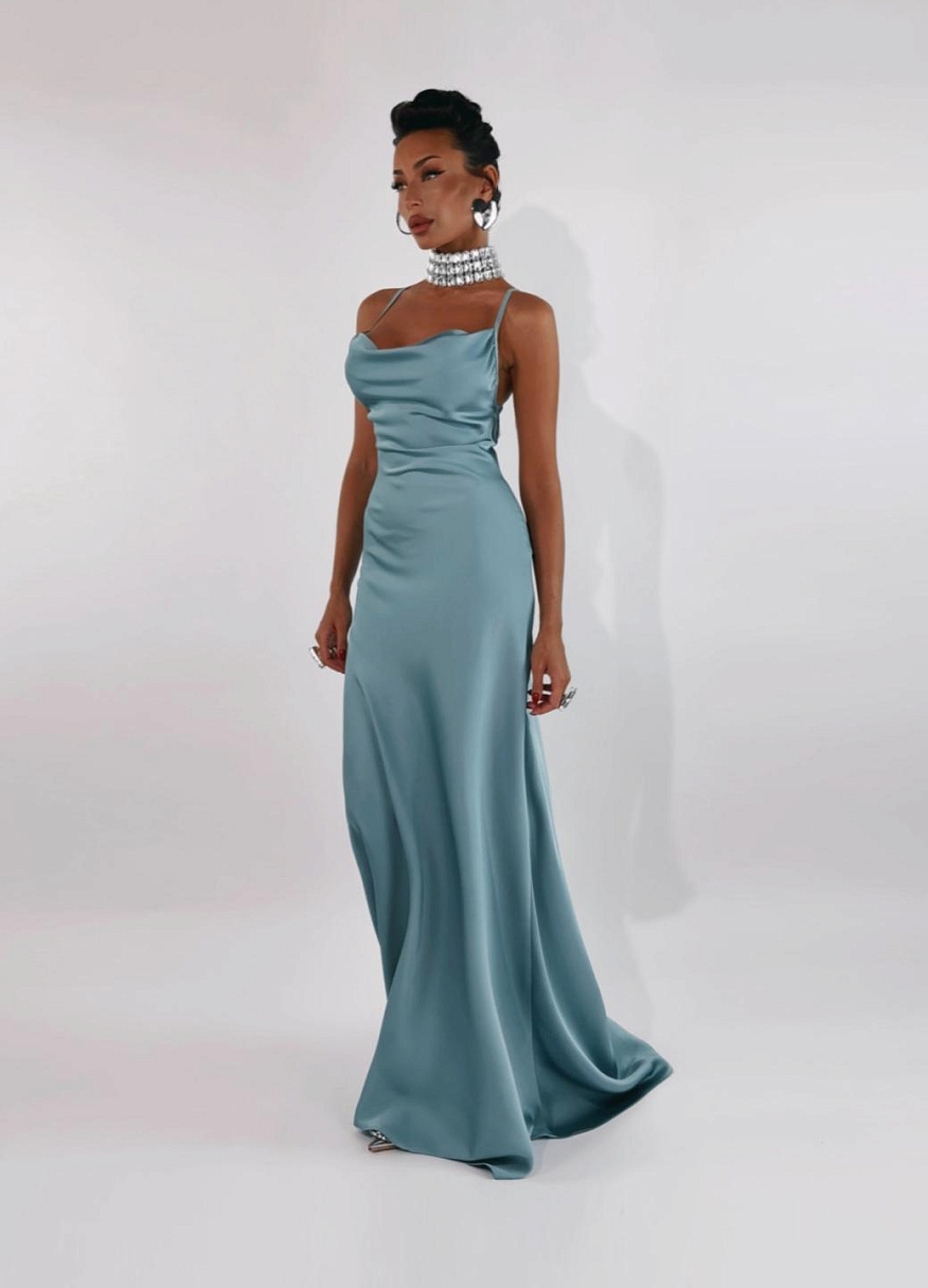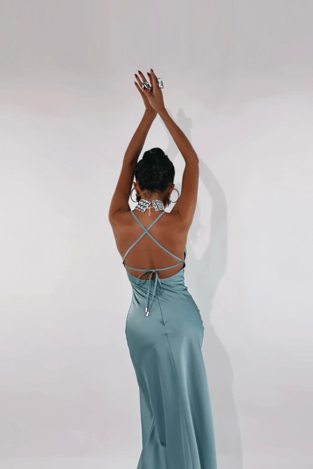 Длинное платье в пол с изящными узкими бретелями, переходящими в тонкую шнуровку на спине, словно оживает, когда вы надеваете его. Шнуровка затягивается, обрамляя спину и оставляя её обнажённой до талии, создавая ощущение утончённой соблазнительности.