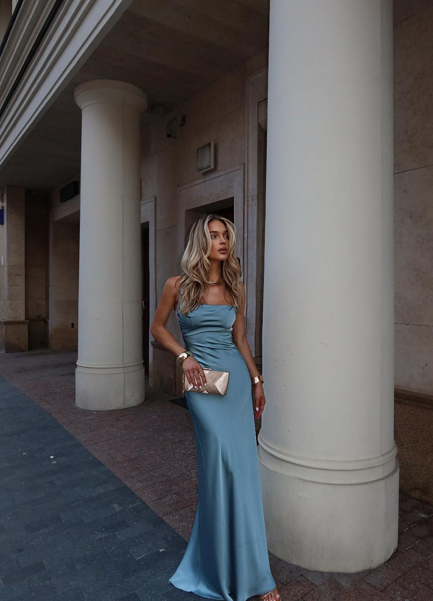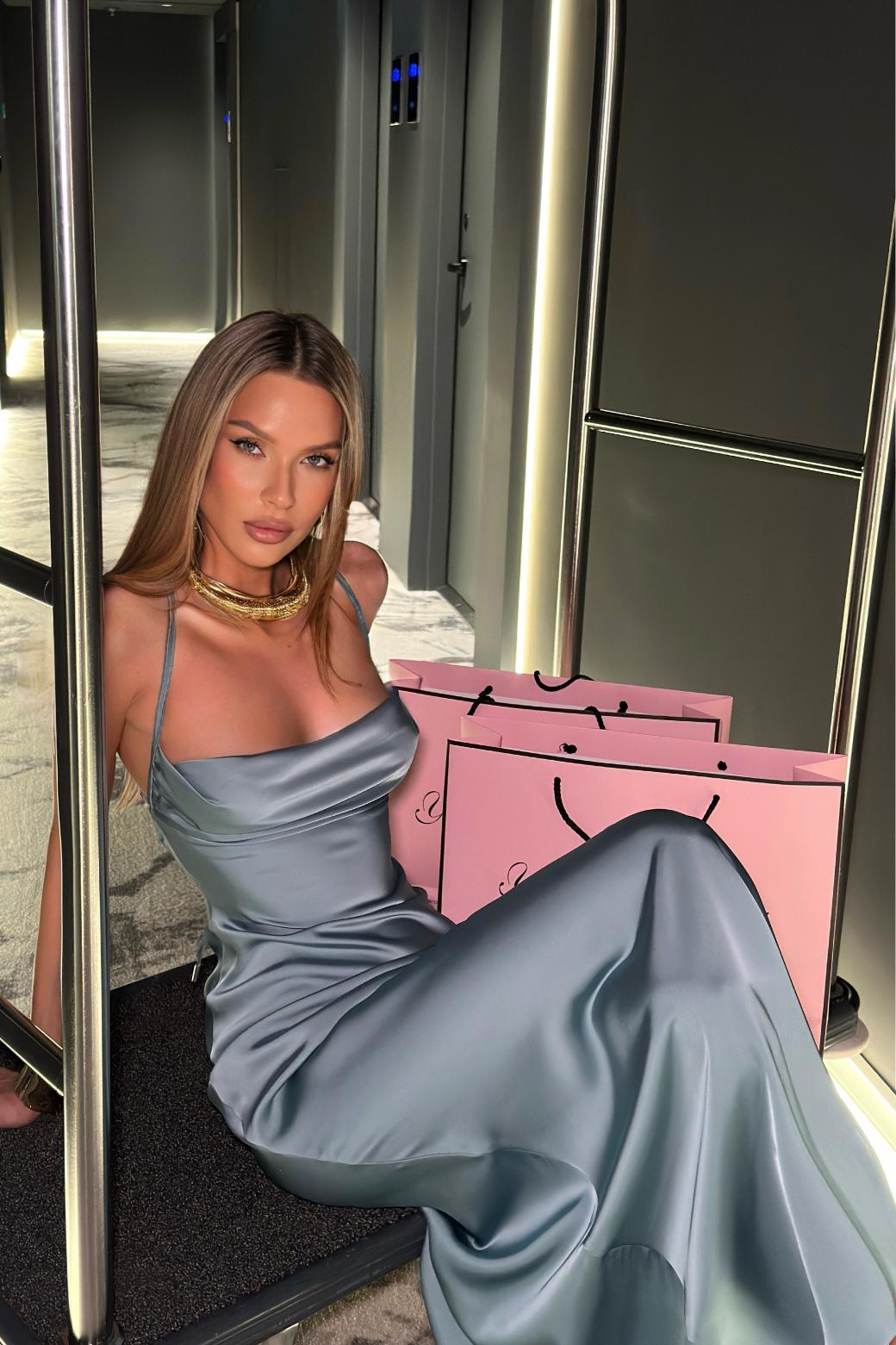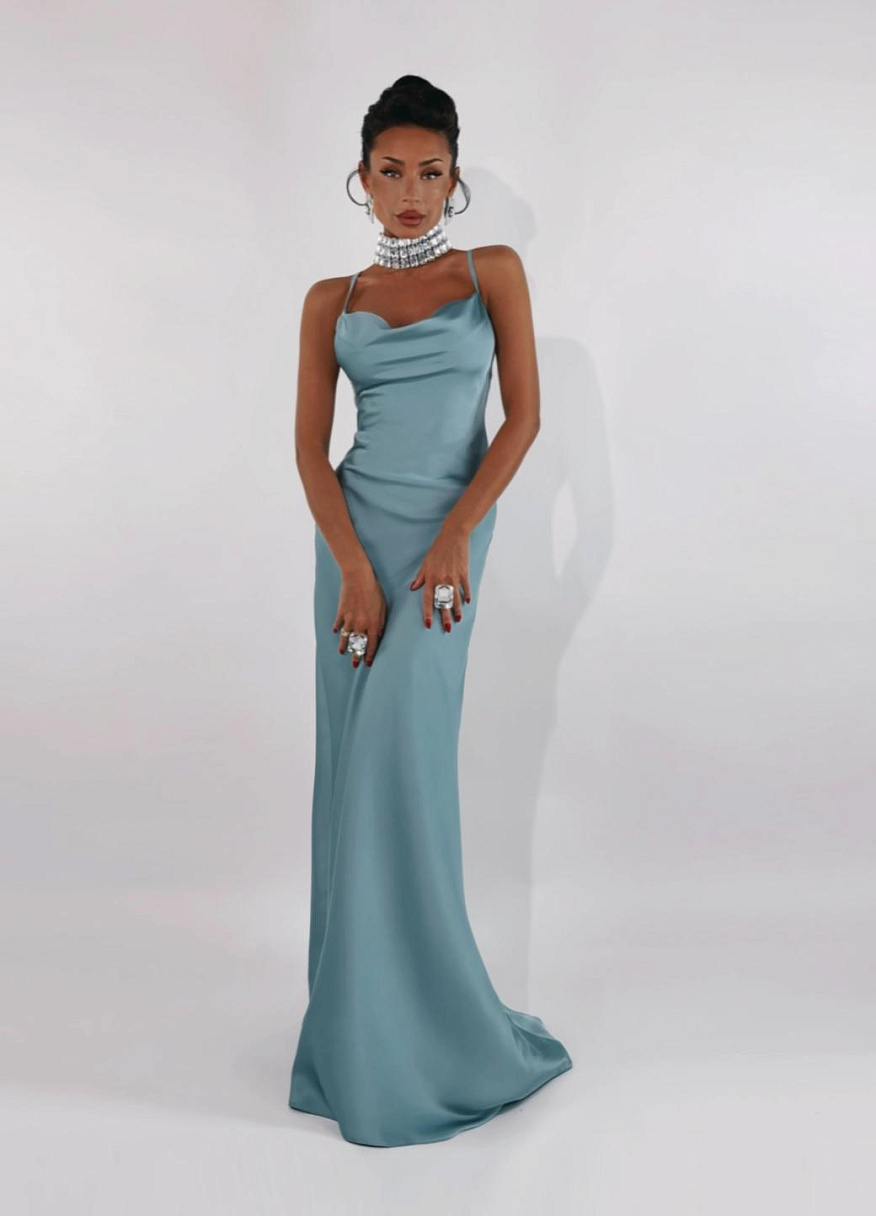Длинное платье в пол с изящными узкими бретелями, переходящими в тонкую шнуровку на спине, словно оживает, когда вы надеваете его. Шнуровка затягивается, обрамляя спину и оставляя её обнажённой до талии, создавая ощущение утончённой соблазнительности.