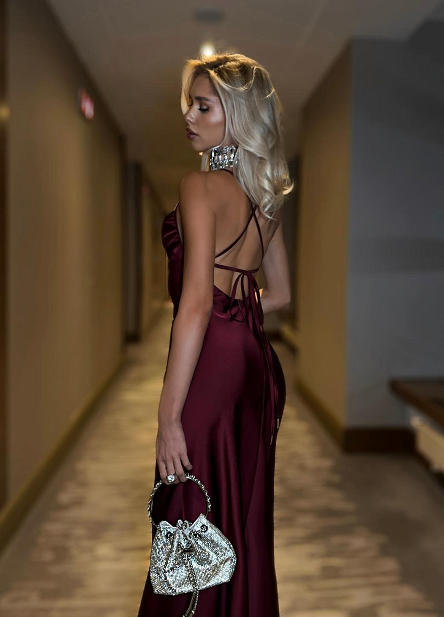 Длинное платье в пол с изящными узкими бретелями, переходящими в тонкую шнуровку на спине, словно оживает, когда вы надеваете его. Шнуровка затягивается, обрамляя спину и оставляя её обнажённой до талии, создавая ощущение утончённой соблазнительности.
