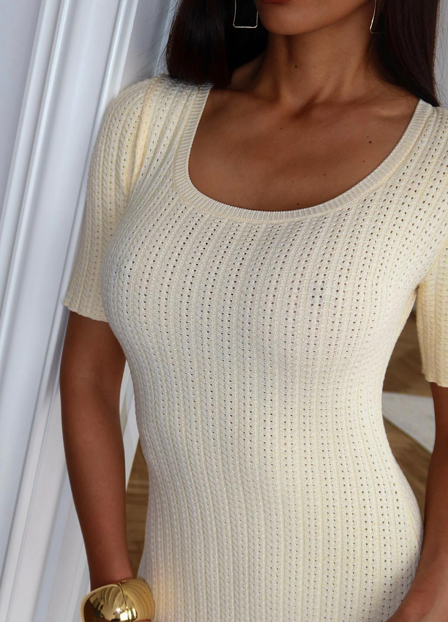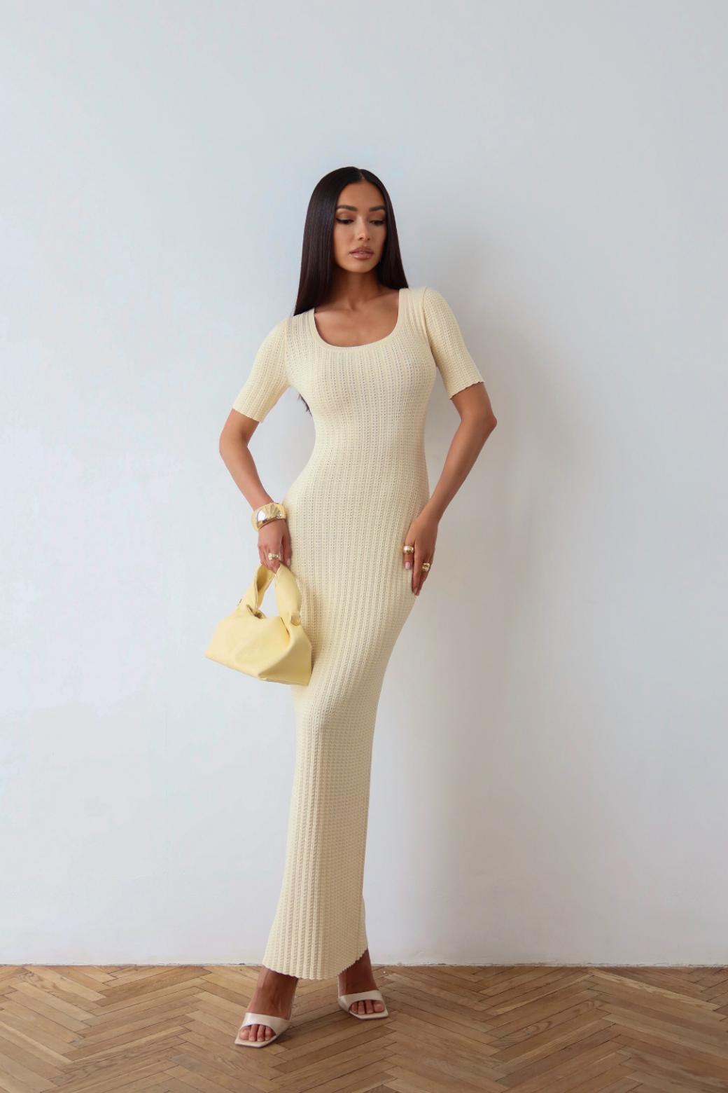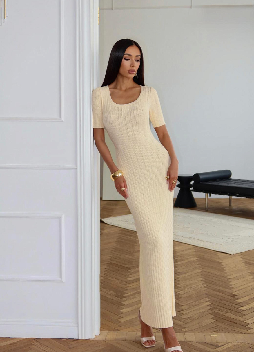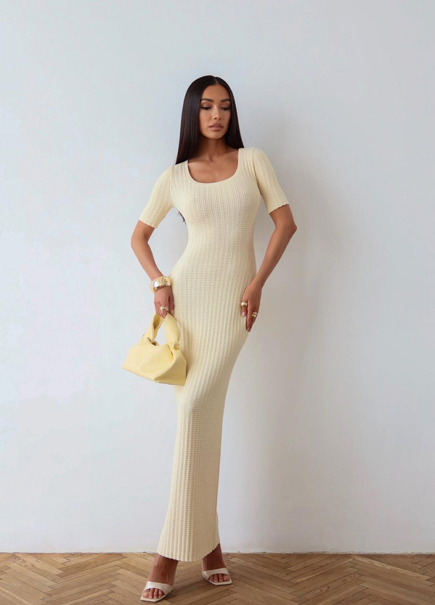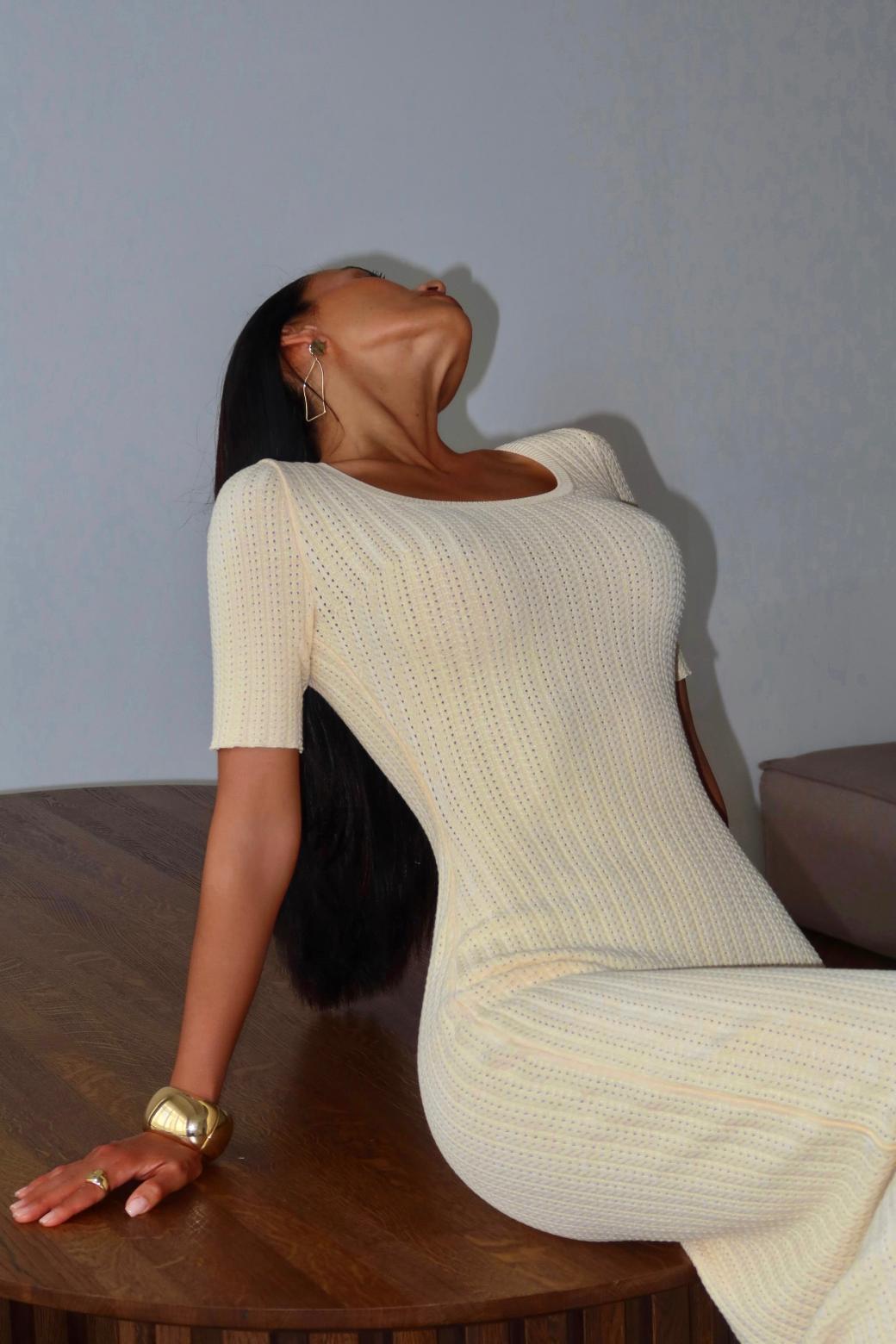Это не просто трикотаж, это технология, доведённая до совершенства. Благодаря уникальной ажурной вязке и скрытым элементам, платье идеально повторяет линии тела: подчёркивает грудь, плавно очерчивает талию и мягко ложится по пояснице. Всё это — с искусной точностью, но без излишней вычурности.