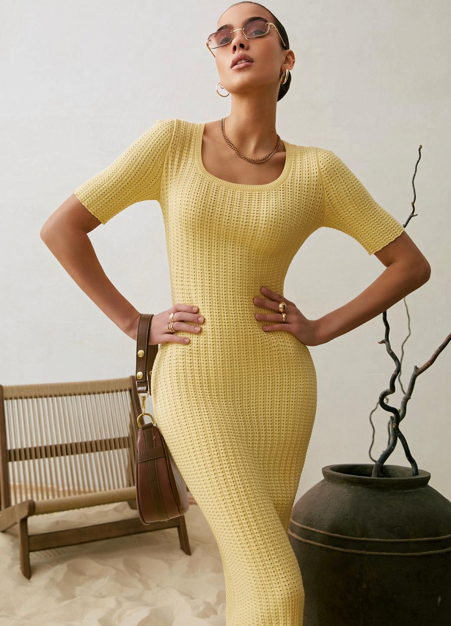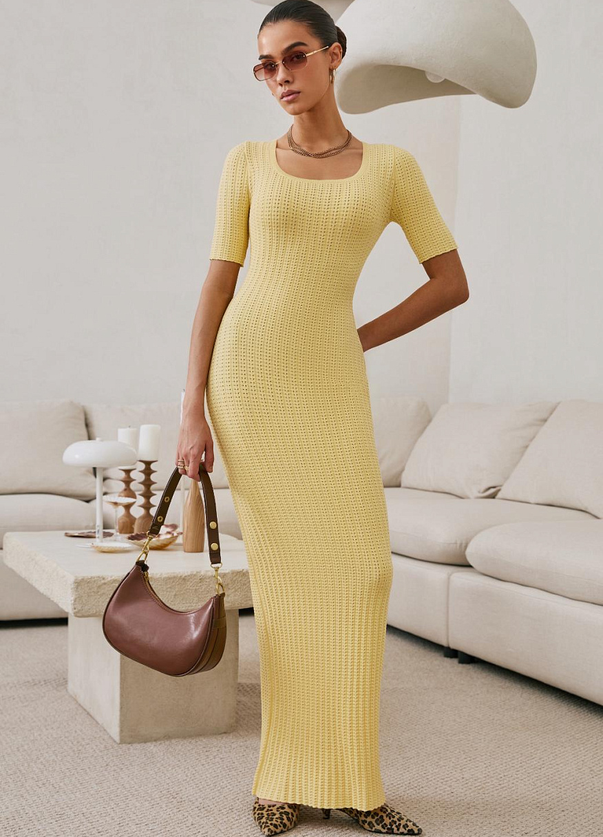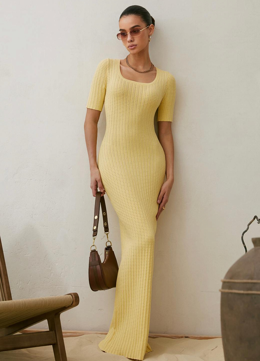 Это не просто трикотаж, это технология, доведённая до совершенства. Благодаря уникальной ажурной вязке и скрытым элементам, платье идеально повторяет линии тела: подчёркивает грудь, плавно очерчивает талию и мягко ложится по пояснице. Всё это — с искусной точностью, но без излишней вычурности.