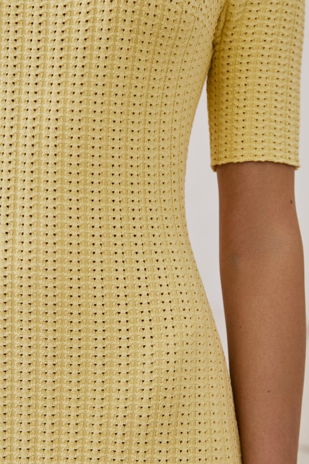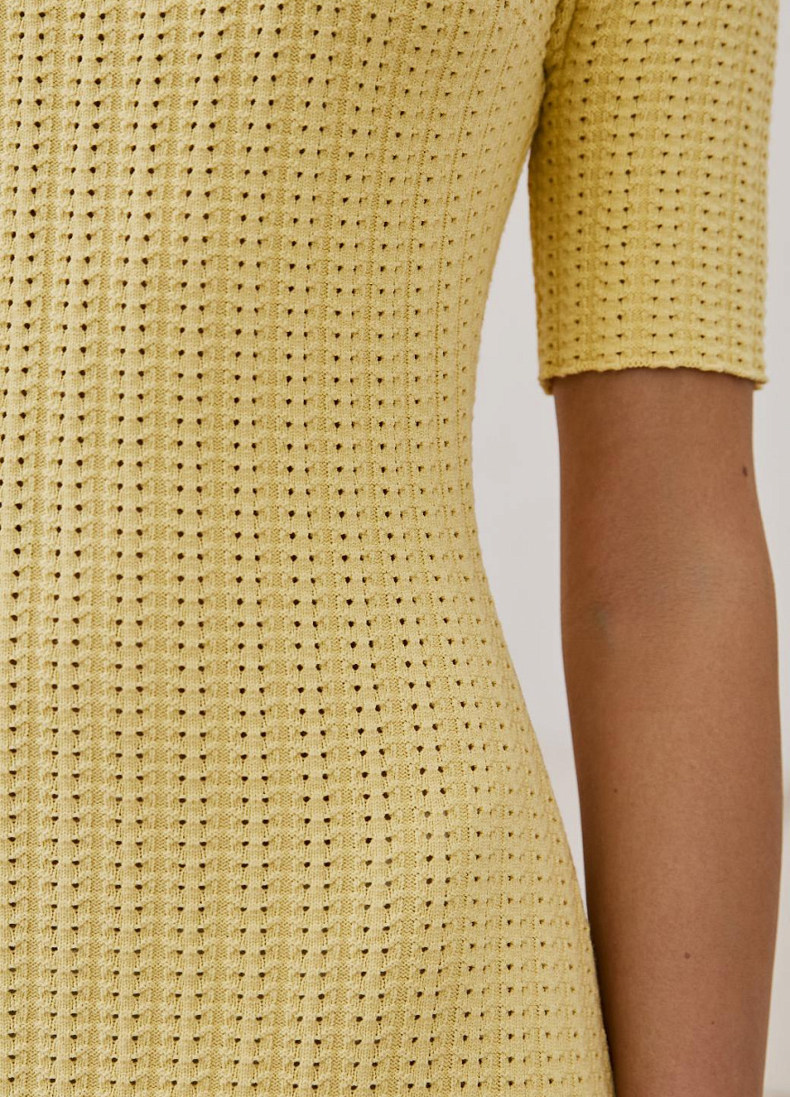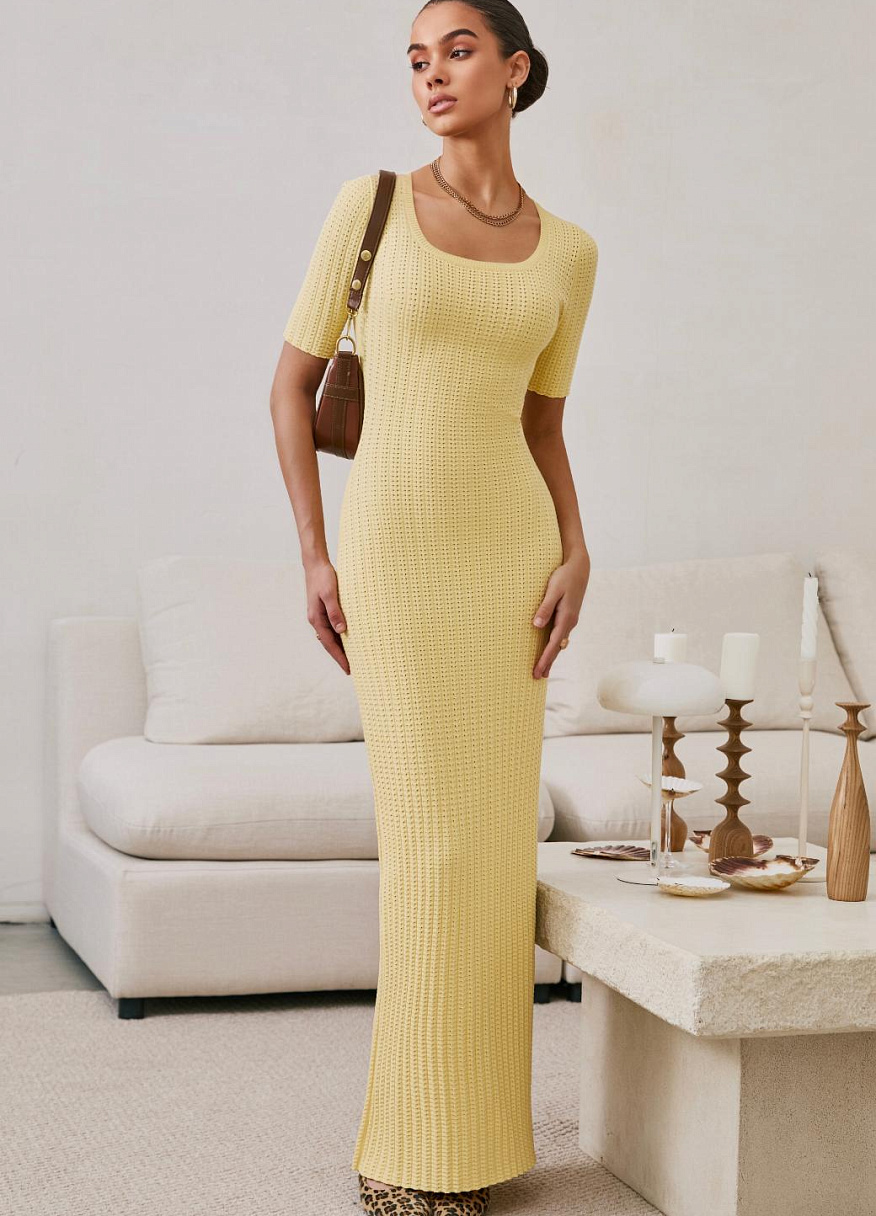 Это не просто трикотаж, это технология, доведённая до совершенства. Благодаря уникальной ажурной вязке и скрытым элементам, платье идеально повторяет линии тела: подчёркивает грудь, плавно очерчивает талию и мягко ложится по пояснице. Всё это — с искусной точностью, но без излишней вычурности.