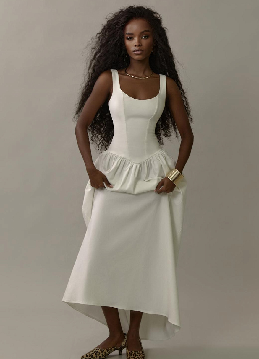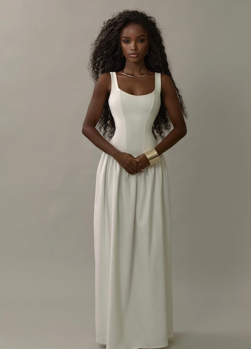 Его изысканный силуэт подчёркивает женственность: приталенный крой нежно обнимает фигуру, рельефные линии создают утончённую талию, а двойной лиф деликатно поддерживает грудь, позволяя забыть о белье. Глубокий округлый вырез делает образ чувственным, а пышная юбка добавляет тот самый, едва уловимый шарм, как у куколки из сказки.