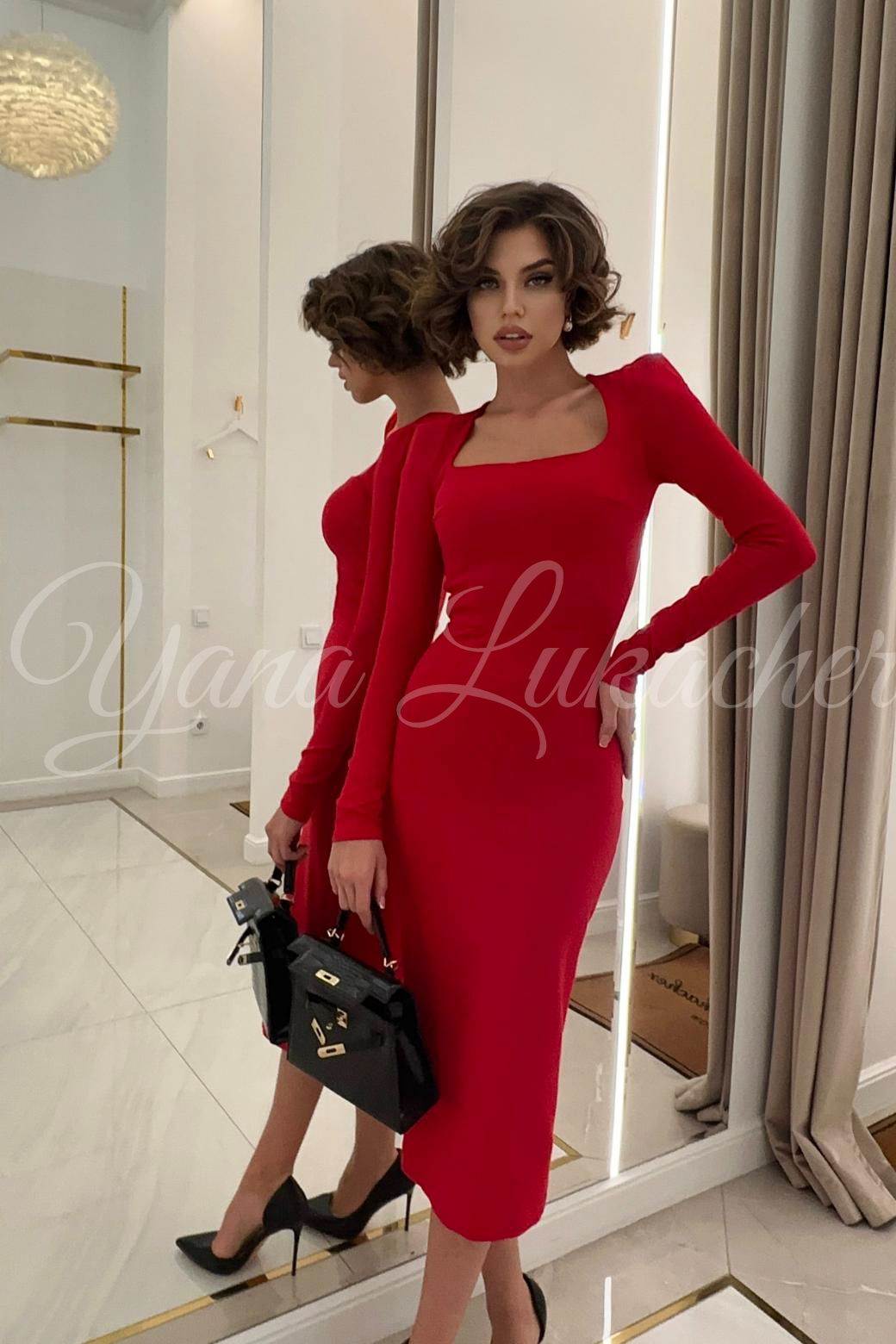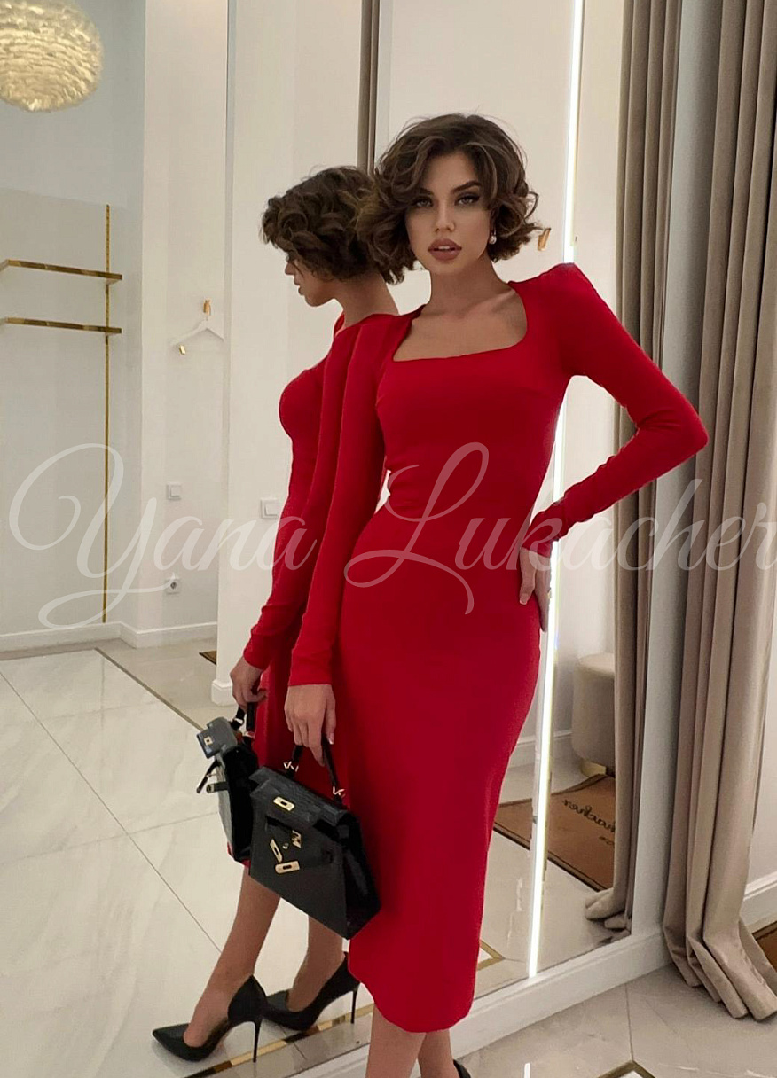 Безупречное силуэтное платье «Валькирия», в котором невозможно остаться незамеченной. Модель выполнена из высококачественного трикотажа Джерси, обладающего особой плотностью и эластичностью, а также приятными тактильными свойствами. Изделие имеет глубокий квадратный вырез, подчеркивающий изящество линий декольте и ключиц. Соблазнительная линия плеч является акцентом и достигается благодаря специальному подплечнику,  прилегающий крой с рельефными и вытачками создает идеальную посадку по фигуре, а миди длина делает силуэт более выразительным.