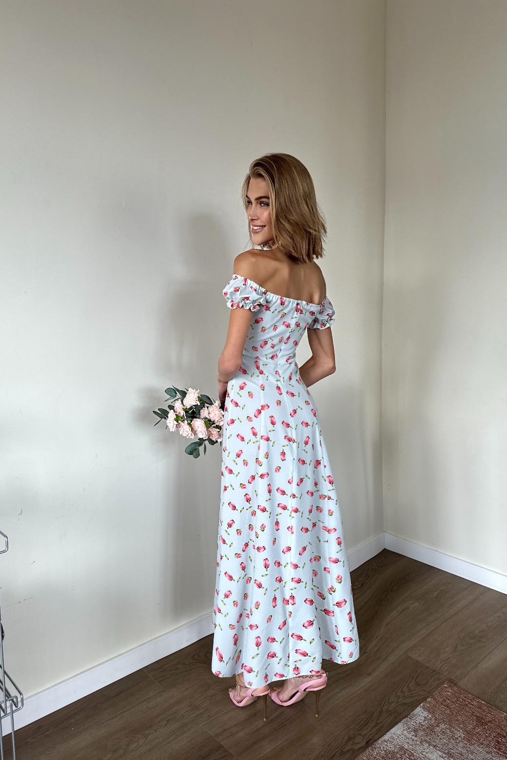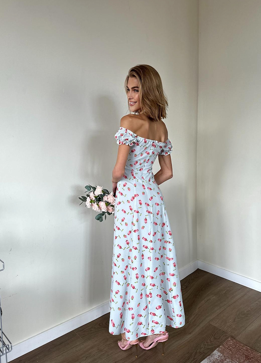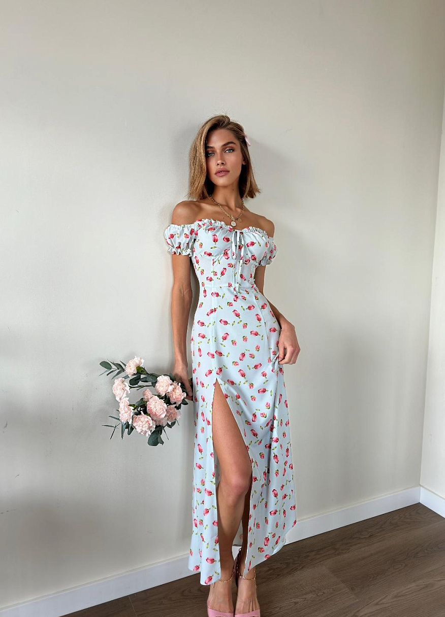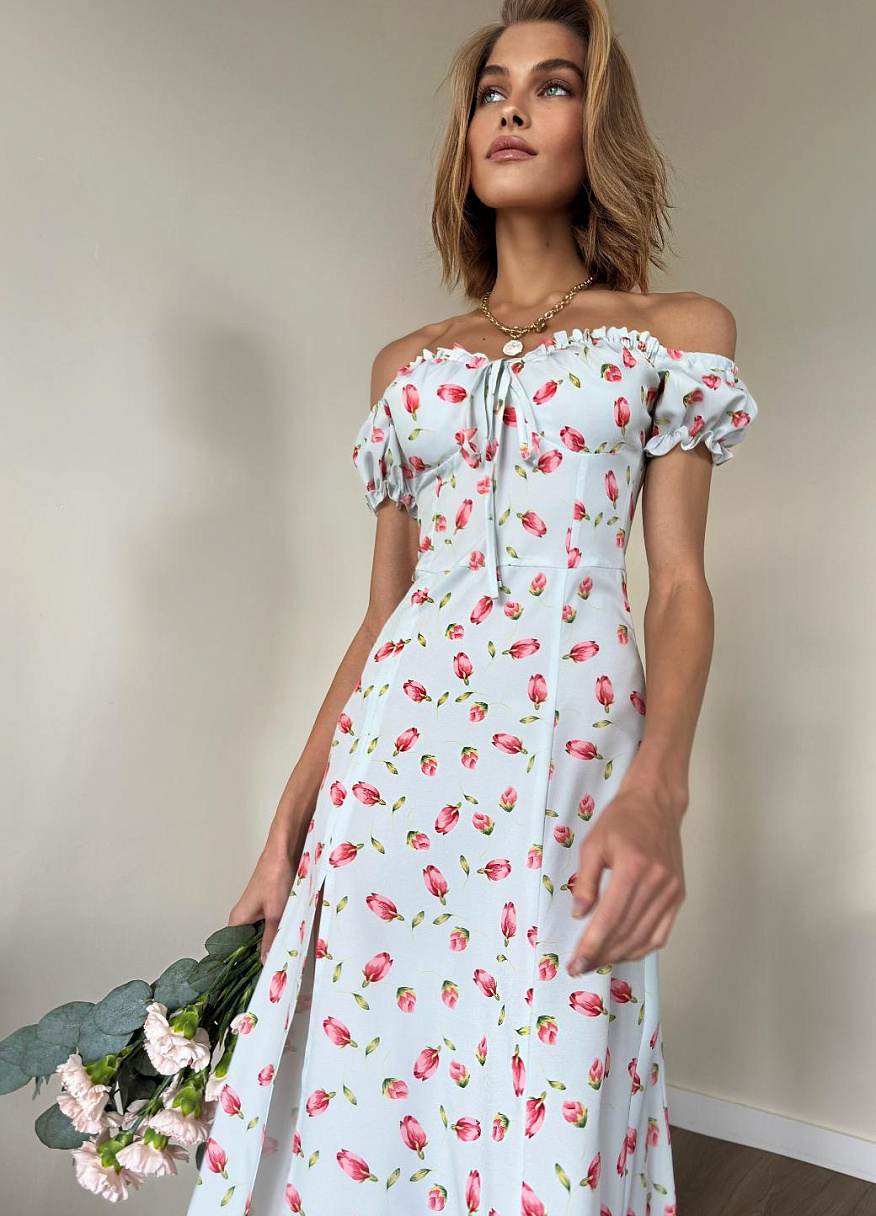 Его мягкий, струящийся силуэт подчёркивает талию, а расклёшенная юбка с разрезом придаёт образу изящность и свободу. Лёгкие рюши на чашечках и рукавах дарят ощущение романтики и нежности.