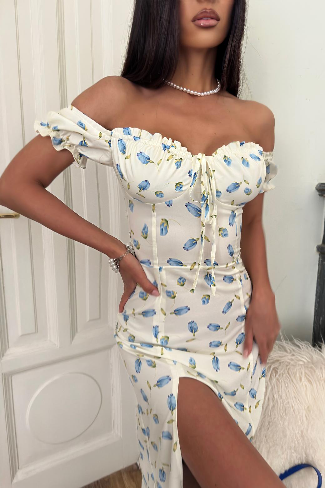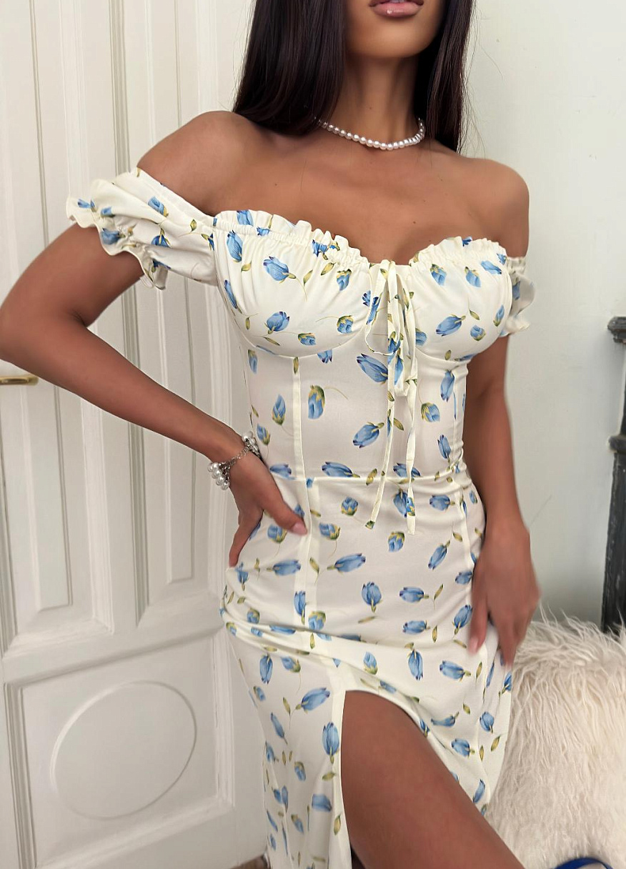 Его мягкий, струящийся силуэт подчёркивает талию, а расклёшенная юбка с разрезом придаёт образу изящность и свободу. Лёгкие рюши на чашечках и рукавах дарят ощущение романтики и нежности.