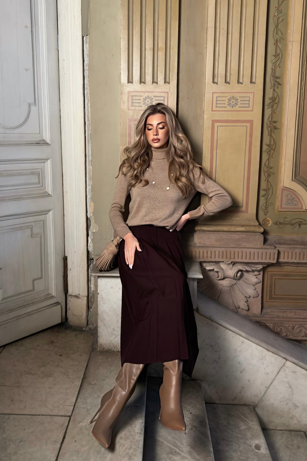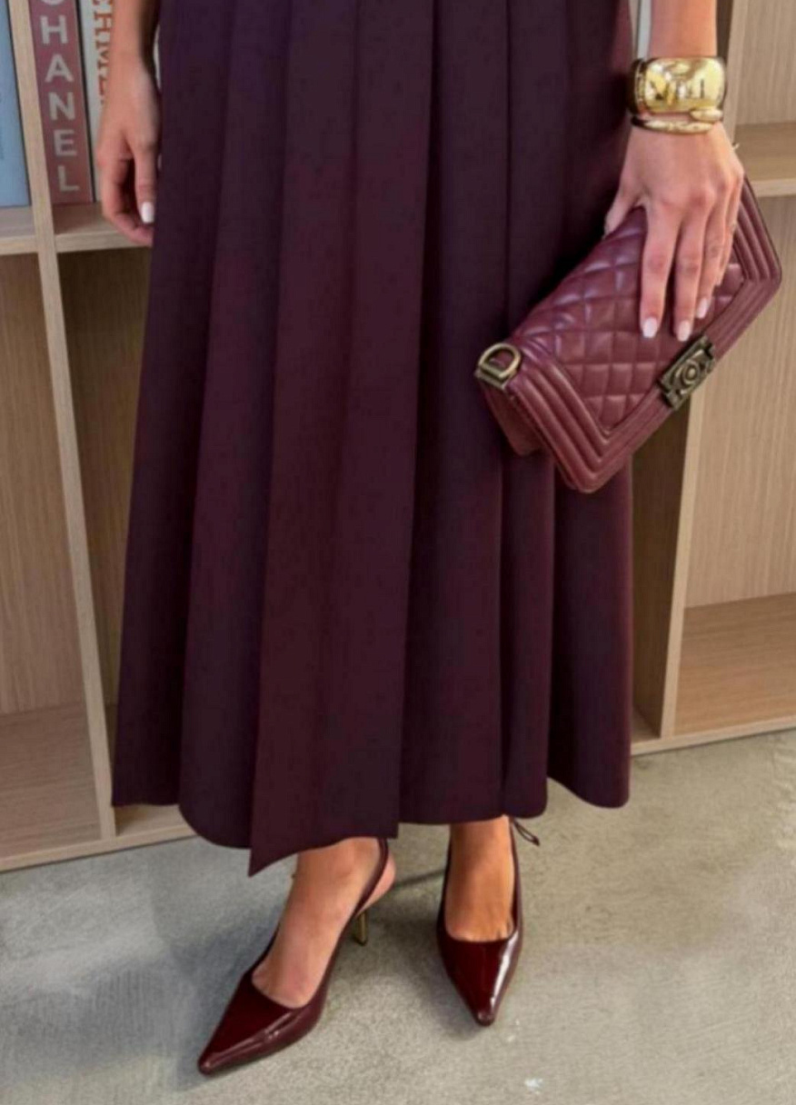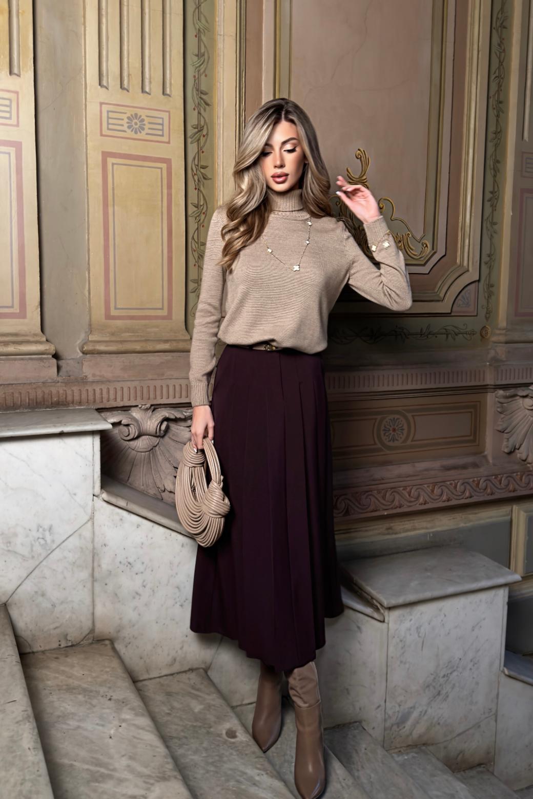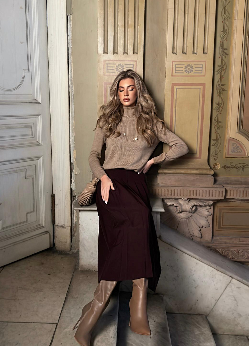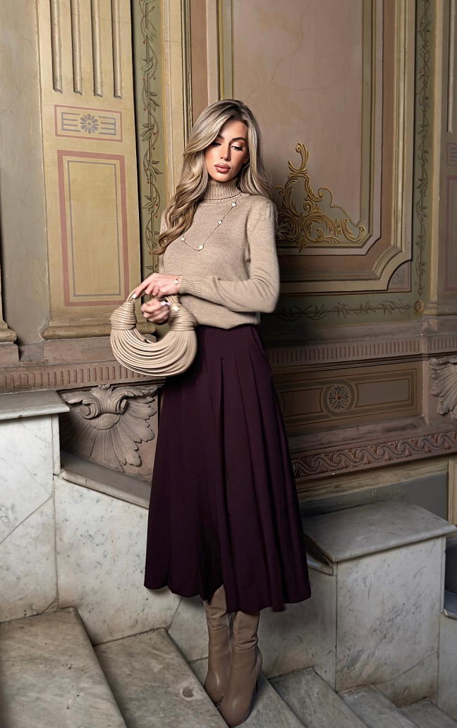 Юбка «Мона» легко сочетается с блузками, свитерами и жакетами, оставаясь уместной в самых разных ситуациях. Она одинаково хорошо работает в повседневных и более выходных образах, не требуя сложных стилистических решений. Это стильная юбка в складку, которая становится основой гардероба.