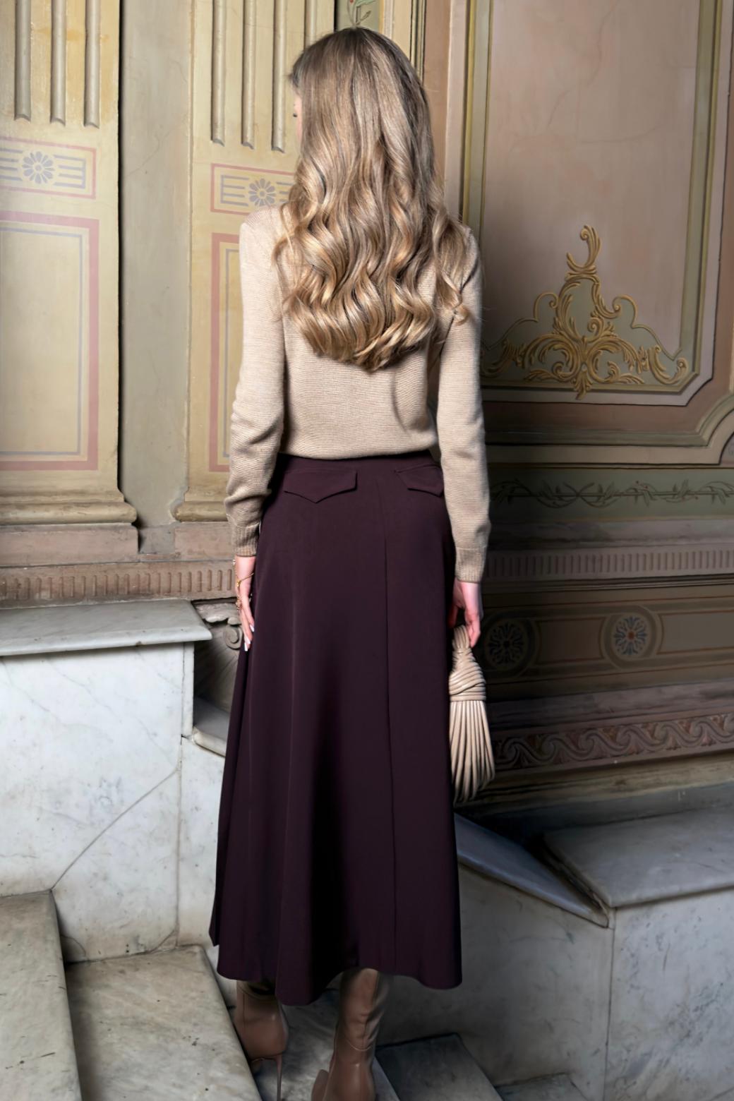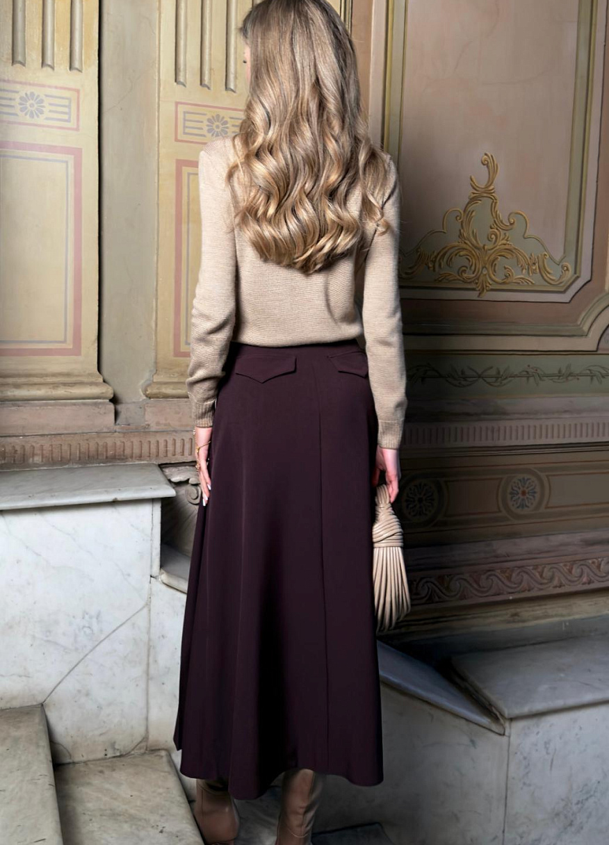 Силуэт мягко расширяется к низу, подчёркивая фигуру и сохраняя лёгкость походки. Складки по передней части добавляют объёма и ритма, не перегружая образ, а карманы выглядят естественно и современно. Молния по полочке в среднем шве обеспечивает чистую посадку, вытачки на задней половинке формируют аккуратный контур, а декоративные клапаны сзади становятся деликатным акцентом, который раскрывается при движении.